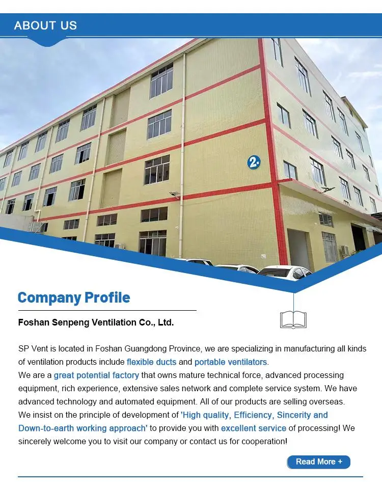 SP Vent is located in Foshan Guangdong Province, we are specializing in manufacturing all kinds of ventilation products include flexible ducts and portable ventilators.