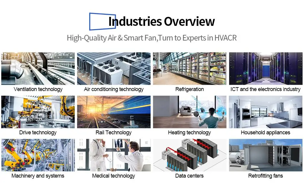 2. EC/DC/AC Axial Fans: We provide high-performance, high-efficiency EC/DC/AC axial fans for ventilation, air conditioning, and refrigeration applications. These fans offer excellent airflow capacity and energy optimization, creating comfortable and healthy indoor environments.