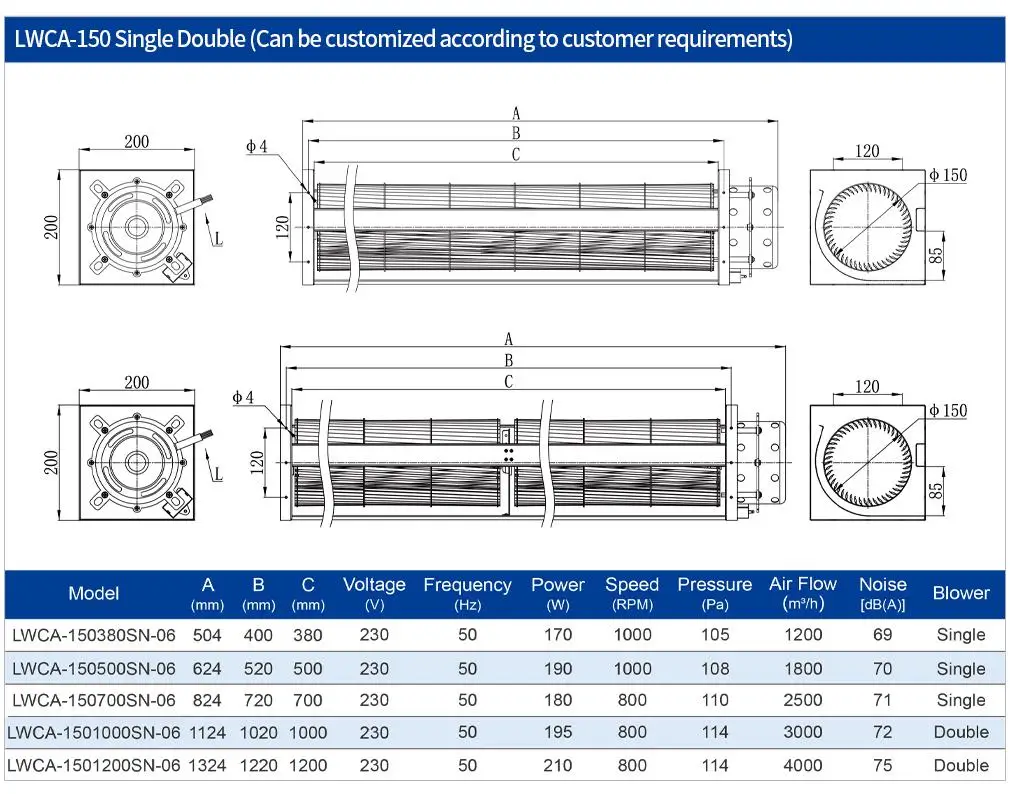 150mm Tangential Fan AC Tangential Fan 230V Aluminum Cross Flow 800-1100RPM Cfmhigh Speed Blower Room Cooling Customize HVAC