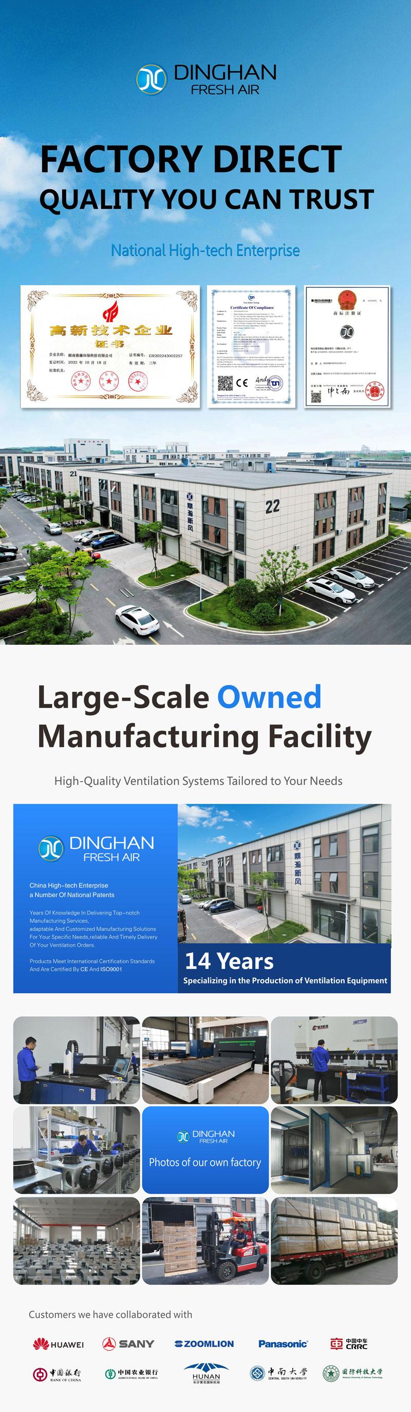 Hunan Dinghan Environmental Protection Technology Co., Ltd. is China’s well-known fresh air system, purified fresh air system, air heat recovery processing equipment development, sales, installation, after-sales in one of the enterprises, the company focuses on the central ventilation system industry for many years, with a number of “invention patents” and “National High-tech Enterprises “Honorary title. Since its inception, the company has been with a number of well-known environmental protection enterprises as well as a number of well-known universities and colleges of long-term technical cooperation. The company’s plant covers an area of more than 5,000 square meters, with the latest production equipment, such as CNC stamping beds, laser cutting machines, plate folding machines, etc., with an annual production capacity of 10,000 sets of heat recovery and fresh air system equipment, and 6,000 sets of purification fresh air machines. According to the current indoor decoration and post-decoration market demand for installation of new air equipment, the company has been dedicated to 9 years of independent research and development of ceiling-mounted, vertical, rotating wheel, module-mounted and other types of heat exchange equipment, as well as the application of small space PM2.5 purification of the new air machine and other products. The company has been dedicated to solving indoor