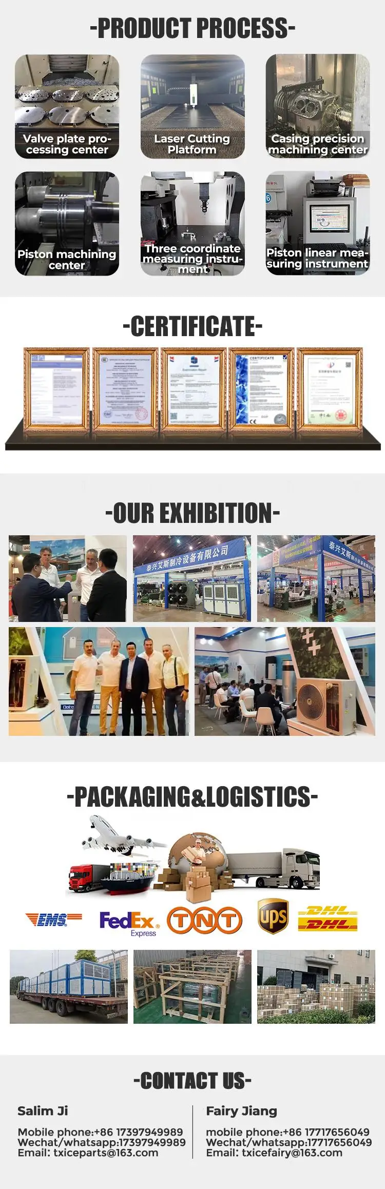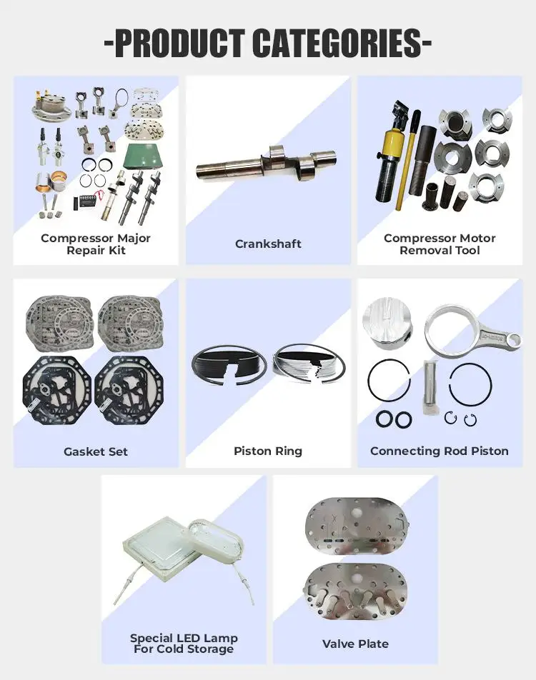 The various brand accessories produced perfectly fit the original compressor, and the maintenance and recovery compressors operate stably; series of refrigeration compressors and refrigeration compression Condensing units, series of chillers, series of ultra-low temperature equipment and other products are widely used in food processing and storage, planting, aquaculture, pharmaceutical storage, refrigerated transportation and many other fields. All brands of accessories, units, etc. are reliable in quality and low in price, and all technical indicators have reached the international advanced level.