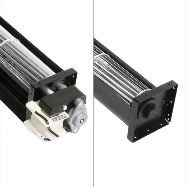 Compact cross-flow fans (e.g., 48mm-60mm) are used in split-system indoor units to deliver uniform airflow with noise levels as low as 18dBA.