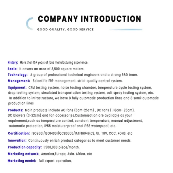 Our company was founded in 2005 and is a comprehensive enterprise specializing in the research and development, production, sales, and related technical support and services of cooling fans. Holding a series of related product certifications such as CE