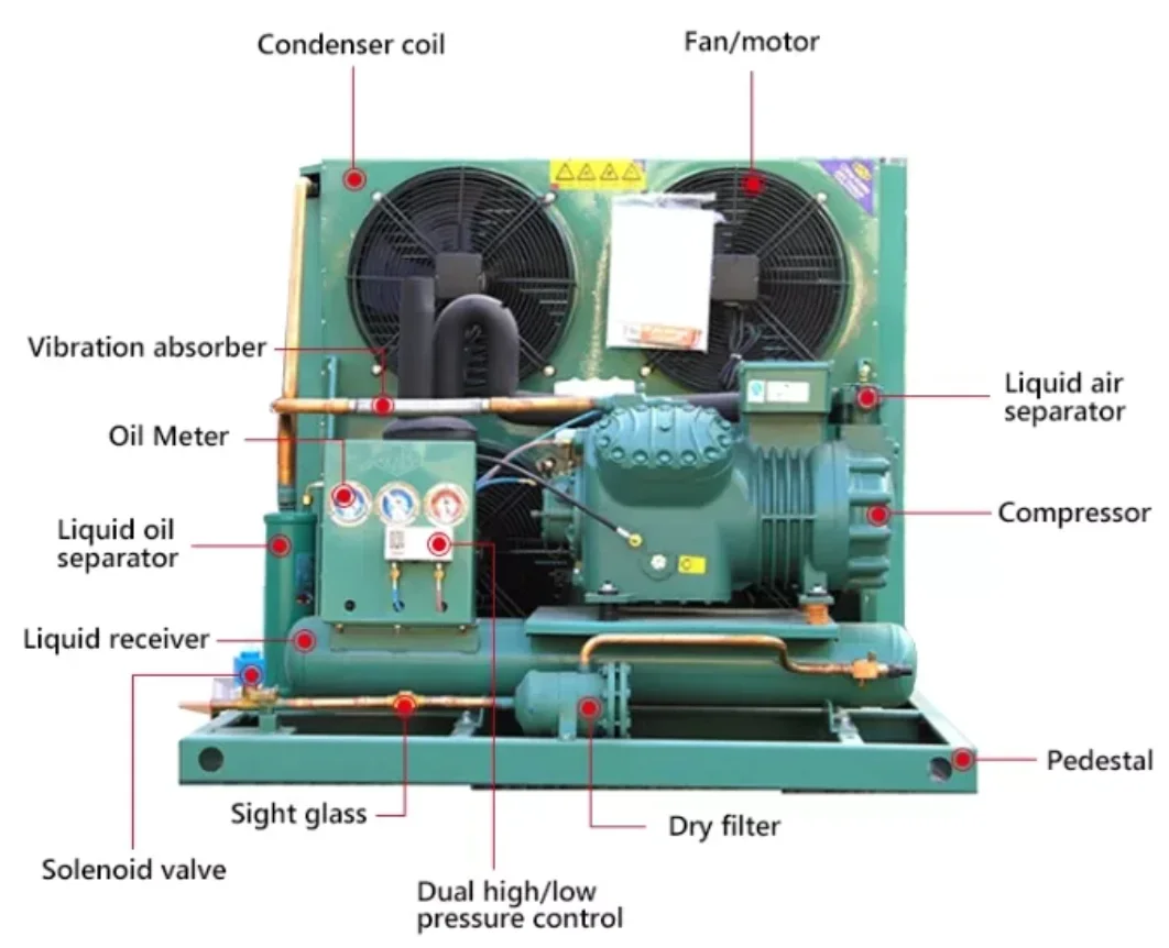 1. Compressor 2.Hydrophilic aluminium Condenser 3. Oil heating 4. Liquid receiver 5. Filter 6. Sight glasses 7. Solenoid valve