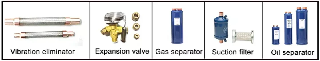 8.H/L P gauge 9. mechanical Pressure controller 10. Oil pressure protection 11. Vibration eliminator 12. Oil separator 13. Gas separator 14. Suction filter |