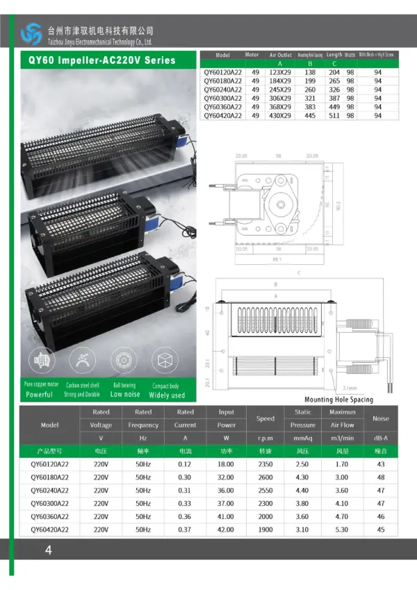 Representative Model: 220V AC power supply, compatible with conventional grid environments, e.g., 60mm industrial exhaust fan (rolling bearing design).