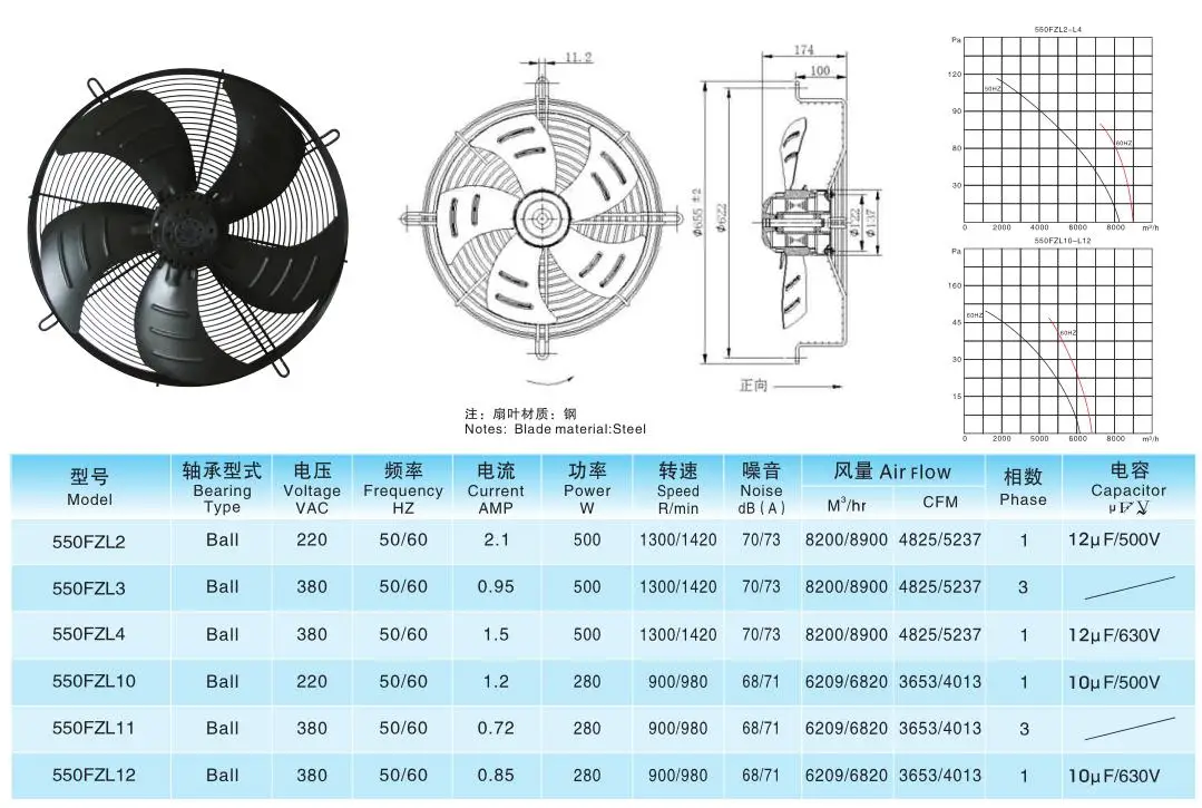 AC Duct Axial Flow Ventilation Fan with Ball Bearing and Steel Blades Electric 220V-380V OEM/ODM Customizable 550FZL