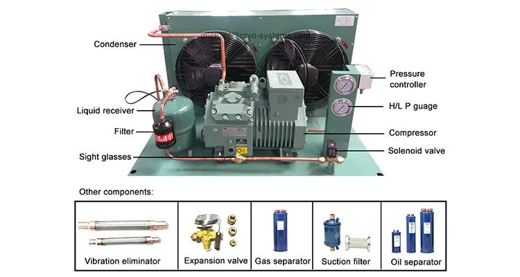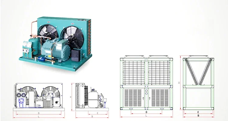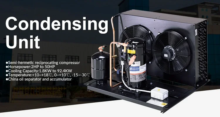 1. The accessories for the unit include liquid receiver, pressure gage, pressure controller,sight glass, filter junction box, etc 2. The copper tube of air cooled Condensina units get through the pressure test, meet the request of normal work. 3.Every part of units is best in corrosion protection. 4. Proper structure, accurate and reliable operating system for the air cooled condensinq unit. 6. Use the high efficiency and large air volume axial fan, with low noise and eneray saving.