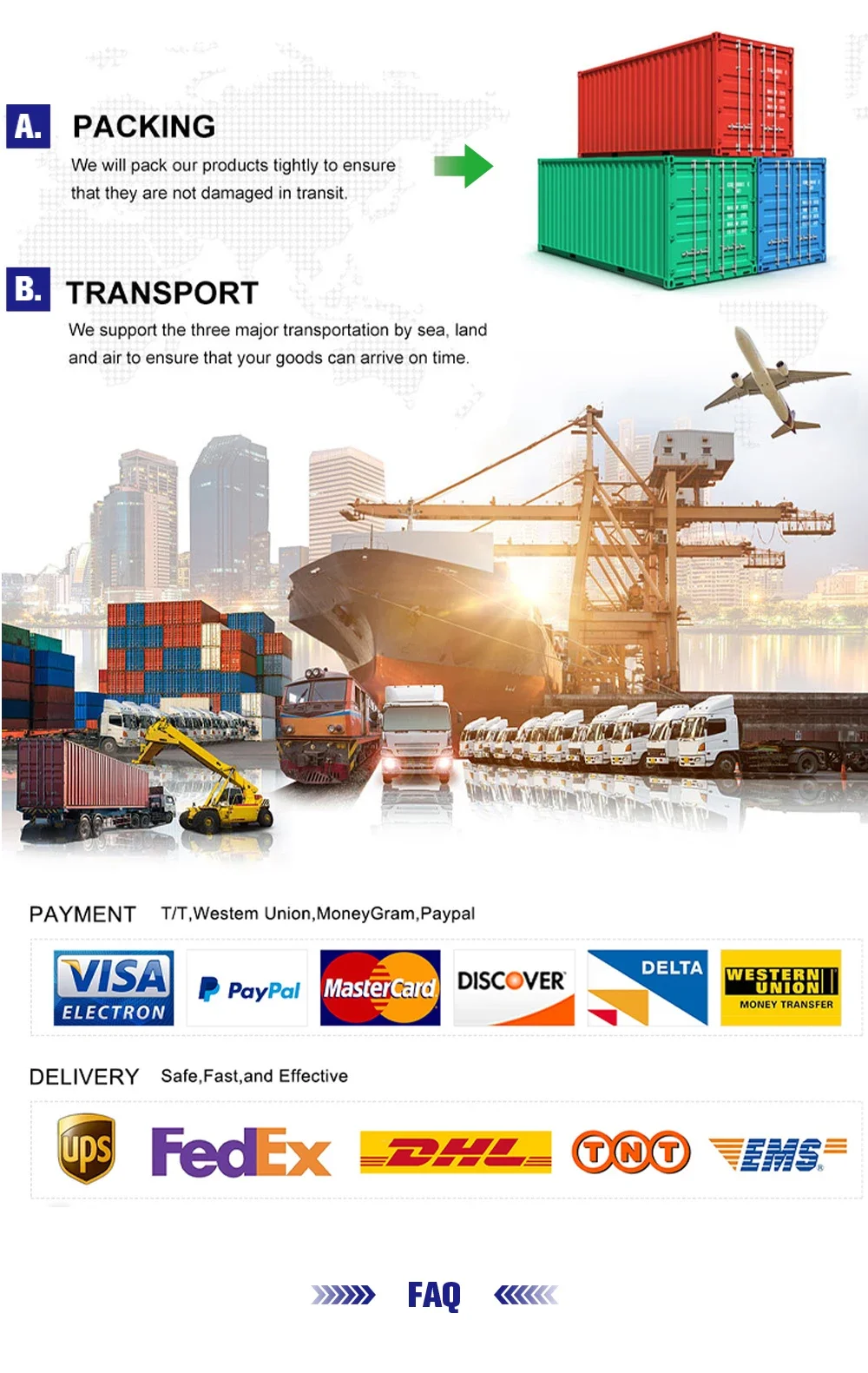 Q: Are you trading company or manufacturer ? A: We are a professional manufacturer with 20 years experience. Q:What’s the advantages of your comopany? A:1.Experienced manufacturers with reliable quality; 2.Leading technology in the industry; 3.Short lead time; 4.Customized product optional; 5.Fast response service team Q:What is your Minimum Order Quality? A. Different products have different MOQ, but we can sell you even one Q: How long is your delivery time? A: It usually takes 7-21days for general products. Q: Is the price on your website is the closing prcie ? A:No,it is just for your reference ,an exact quotation based on your requirement . Please contact us for details. Q:Do you give any discount? A:We’ll surely try our best to help you get those by the price and good service same time.