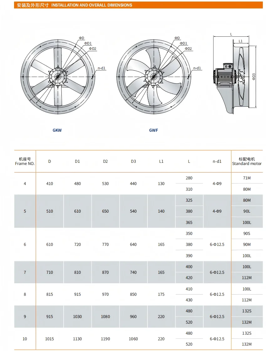 GKW/GWF series drying kiln special high temperature high humidity axial fan,is special designed for drying kiln.It has remarkable characteristic of resistant to high temperature,resistant to high humidity,large air volume,high efficiency,energy saving,and convenient installation.The axial fan is used in the ventilation system for wood drying kiln and other drying equipment.As the blades diameter is different,there are 7 model,No.4,5,6,7,8,9,10.The angle of fan can be adjusted according to the clients’ requirements.