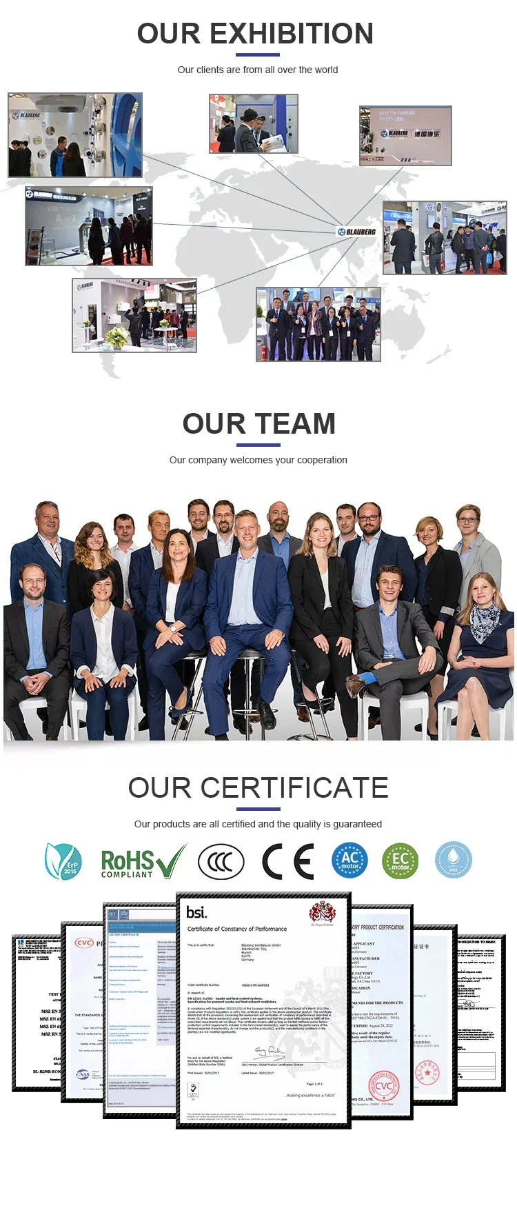 Q1: Wonder if you accept small orders? A1: Do not worry. Feel free to contact us .In order to get more orders and give our clients more convener ,we accept small order. Q2: Can you send products to my country? A2: Sure, we can. If you do not have your own ship forwarder, we can help you. Q3: Can you do OEM for me? A3: We accept all OEM orders,just contact us and give me your design. We will offer you a reasonable price and make samples for you ASAP. Q4: What’s your payment terms ? A4: By T/T,LC AT SIGHT,50% deposit in advance, balance 50% before shipment. Q5: How long is your production lead time? A5:It depends on product and order qty. Normally, it takes us 15 days for an order with MOQ qty. Q6: When can I get the quotation ? A7: We usually quote you within 24 hours after we get your inquiry. If you are very urgent to get the quotation. Please call us or tell us in your mail, so that we could regard your inquiry priority. Q7: Is Blauberg a Chinese Brand? A7: We are a branch company of Blauberg Group. Blauberg Group is a Germany company. Our headquater is in Munich, Germany. Chinese factory is the main production plant of Blauberg Group.