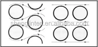 The staggered tube design exposes the tubes to more moving air than the in-line design. The geometry of the staggered tube design also allows the rows to be spaced closer together. This results in a more compact coil providing higher capacities.