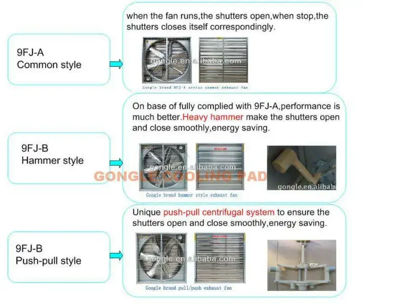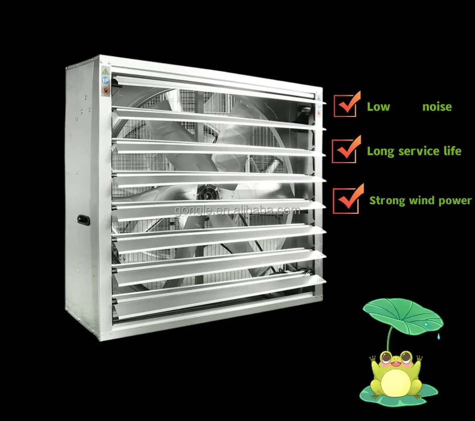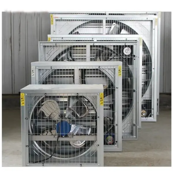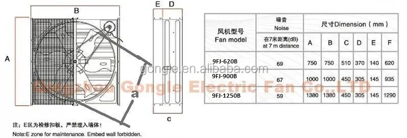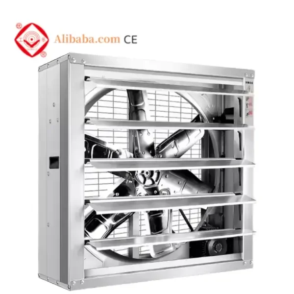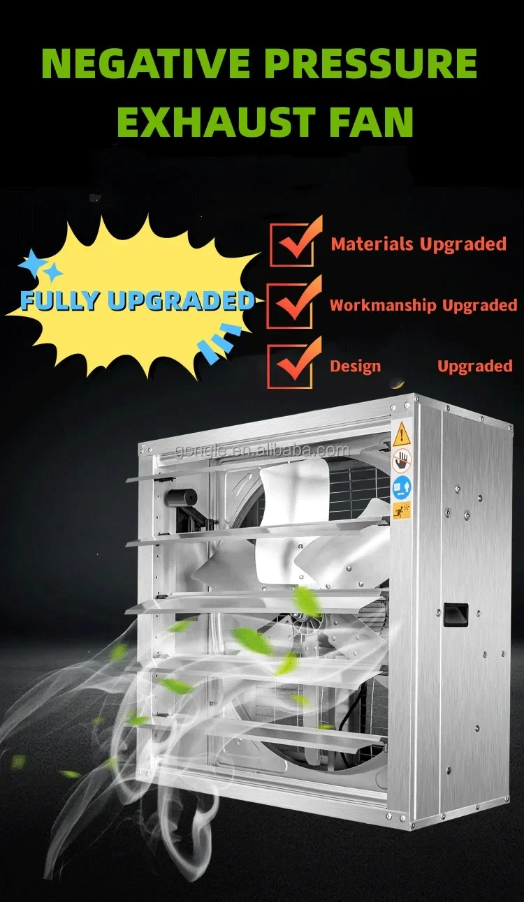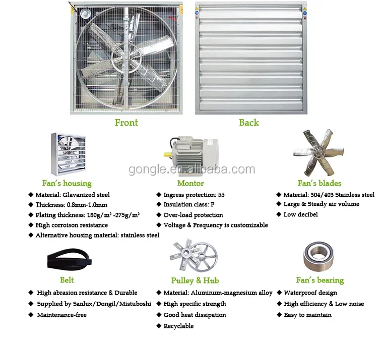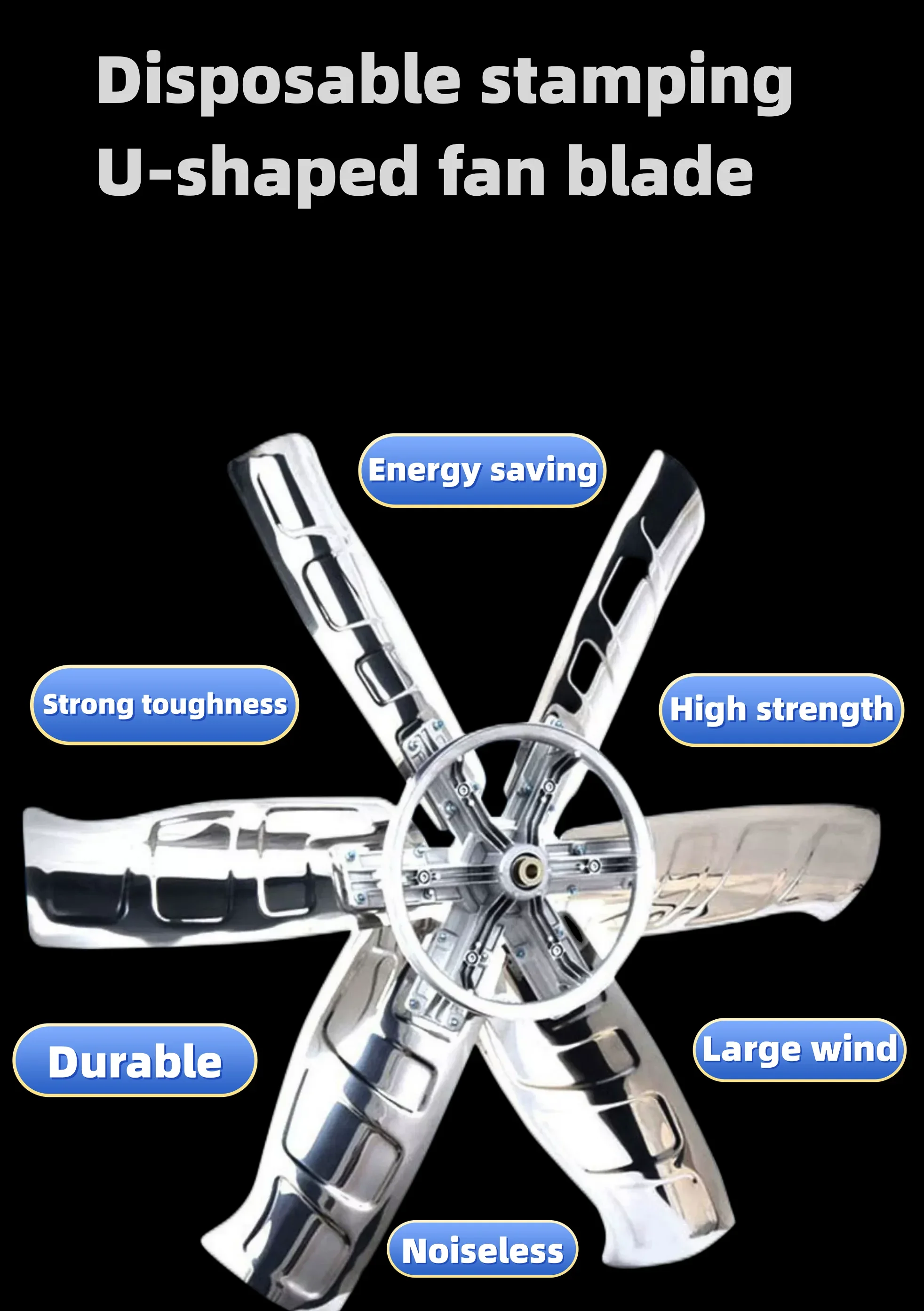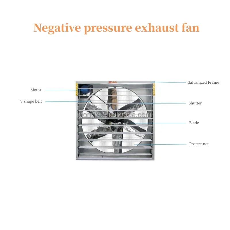 1. Drop hammer fan mainly consists of blade/motor/frame/protect net/bracing cage/shutters. The motor drives blade to cause air