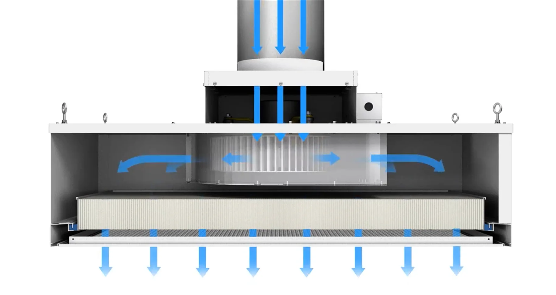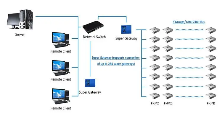 FFU (Fan Filter Unit) is a combination of a fan and filter, also known as a “fan-integrated filtration device.” It is a modular terminal air supply unit with its own power and filtration function. The fan draws air from the top of the FFU, passes it through a HEPA filter, and the filtered clean air is evenly discharged across the entire airflow surface at a velocity of 0.45 m/s ± 20%.