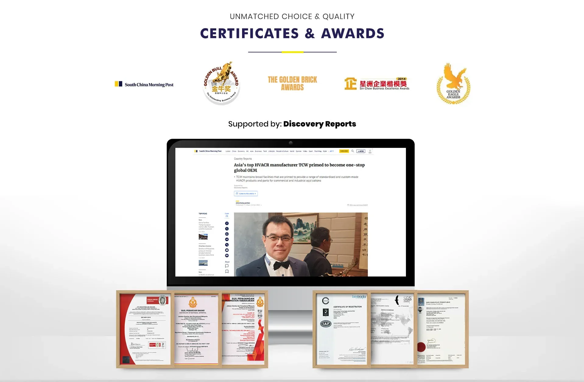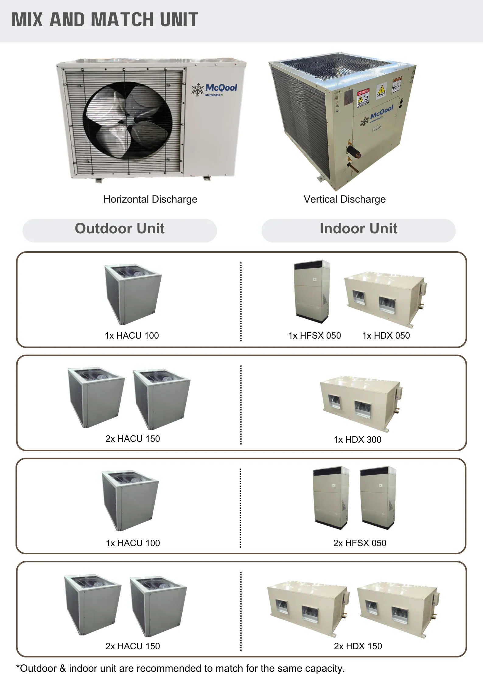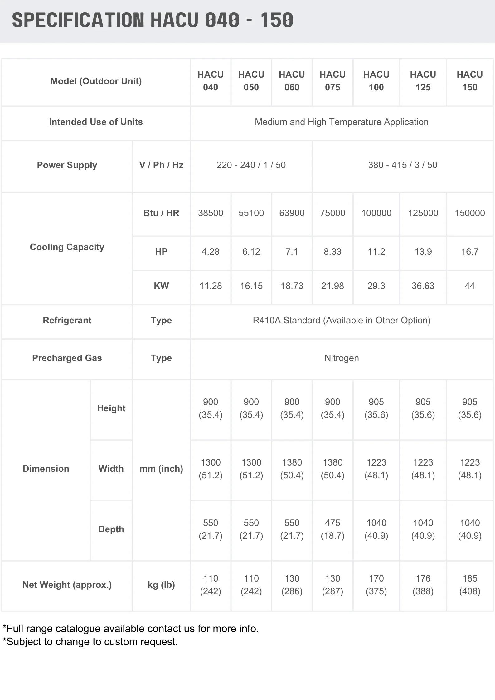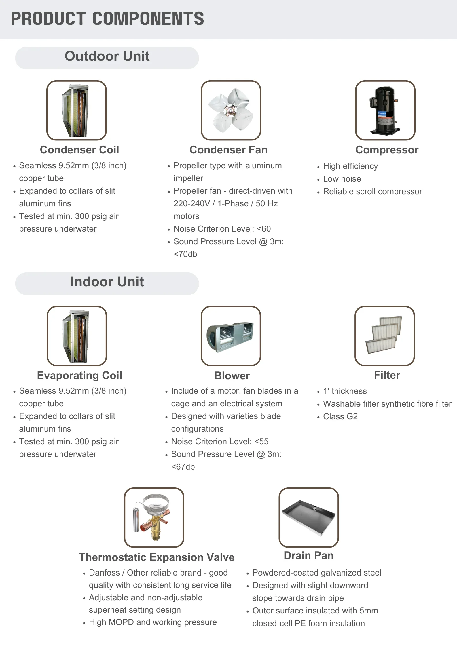 TCW’s Air-Cooled Air Conditioners Our air-cooled air-conditioner ranges from 40K Btu/hr to 150K Btu/hr for commercial applications. Standard specifications include low noise propeller fan, IP55 fan motor, scroll compressor, controller, and phase protector. Air-Cooled Condensing Unit – 40K Btu/hr to 150K Btu/hr High Static Fan Coil Unit – 40K Btu/hr to 750K Btu/hr Floor Standing Unit – 40K Btu/hr to 150K Btu/hr Ducted Fan Coil Guide Specification/Features – The excellent range of fan coil units covers air flow from 600 to 2300 CFM. – These units have been engineered for light industrial and commercial applications. – The compact design requires minimal installation floor space and it maximizes container space for shipment. – Internal components are easily accessible by removing the access panels. – Units completed with coil, one or more centrifugal fans, condensate drain pan, and galvanized steel casing panels insulated with 5 mm closed cell insulation material. – Coil shall be constructed with aluminum fins mechanically bonded to 3/8 dia copper tubing. – Coils are tested under 350 psig, with a maximum design operating pressure 250 psig at <100C. – Coil shall be shipped pressurized with dry nitrogen.