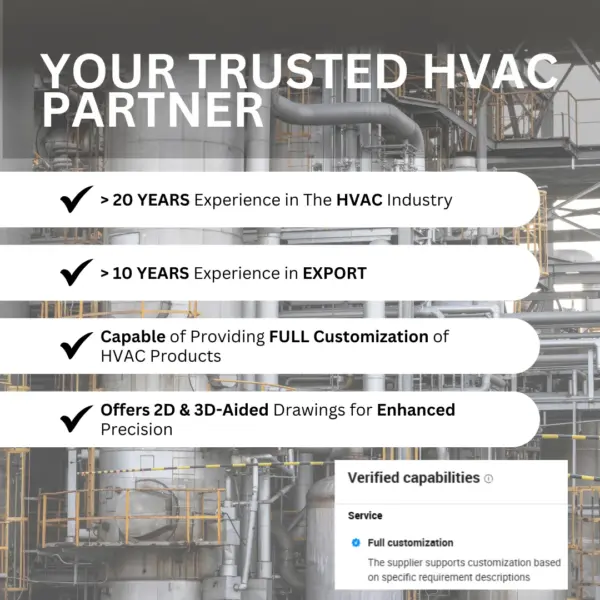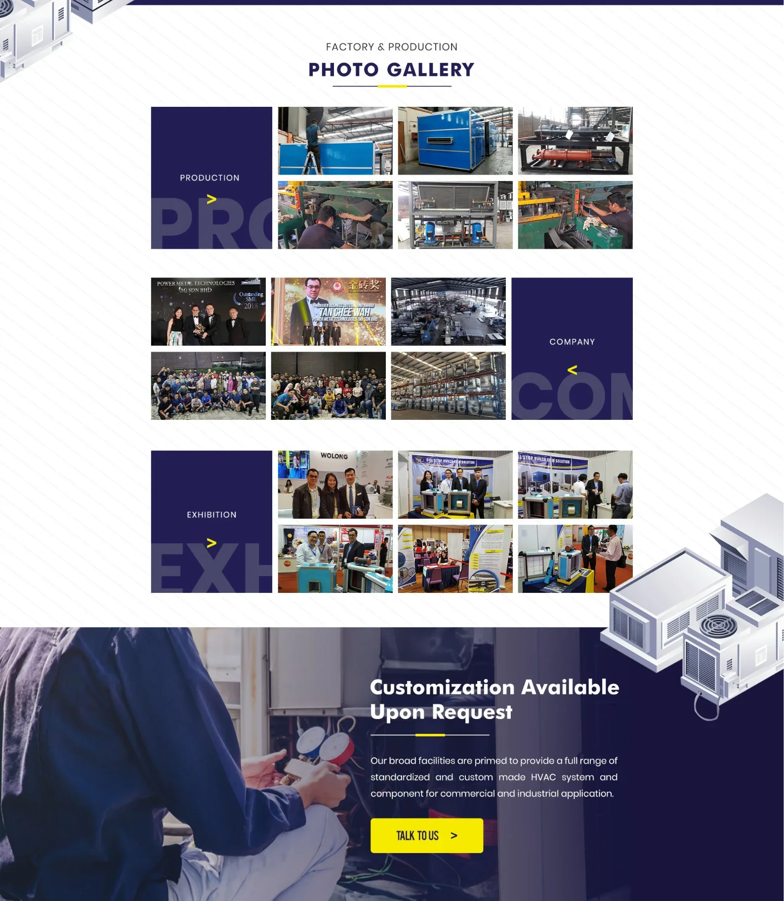 1. Who are we? We are based in Selangor, Malaysia, start from 1997, sell to Domestic Market(35.00%), Southeast Asia(30.00%), South Asia(20.00%), Mid East(15.00%). There are total about 201-300 people in our office. 2. How can we guarantee quality? Always a pre-production sample before mass production; Always final Inspection before shipment; 3. What can you buy from us? Commercial HVAC, Customized HVAC for Oil & Gas Industry, Metal Bed/Sofa Side Table, Metal Kitchen Cabinet Rack (Extandable), Water Filter Kitchen Metal Rack. 4. Why should you buy from us not from other suppliers? One-stop HVAC & Metal Parts Manufacturing. 5. What services can we provide? Accepted Delivery Terms: FOB,CIF,EXW,DDP; Accepted Payment Currency:USD,EUR; Accepted Payment Type: T/T,L/C; Language Spoken:English,Chinese