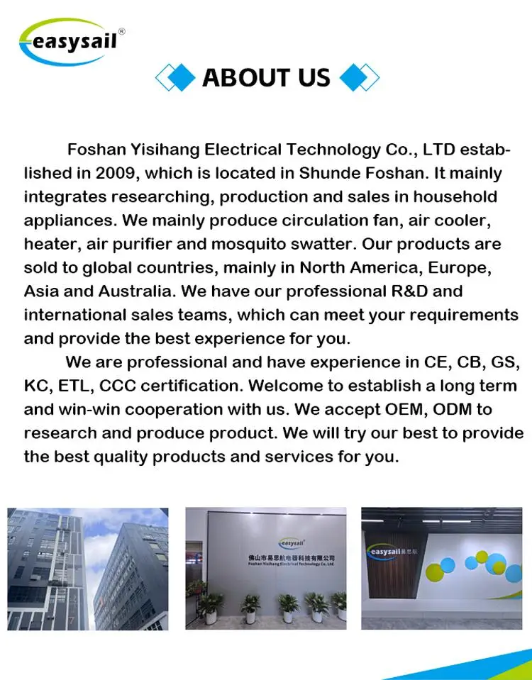 Our main products are:air-cooler, air purifier, mosquito swatter, electric heater,circulating fan and other products the quality of our products to maintain stability and access to a variety of international certification.We sale all over the world. In addition, we have obtained CE、CB、LVD、EMC、ROHS, certificates. In addition, we have obtained