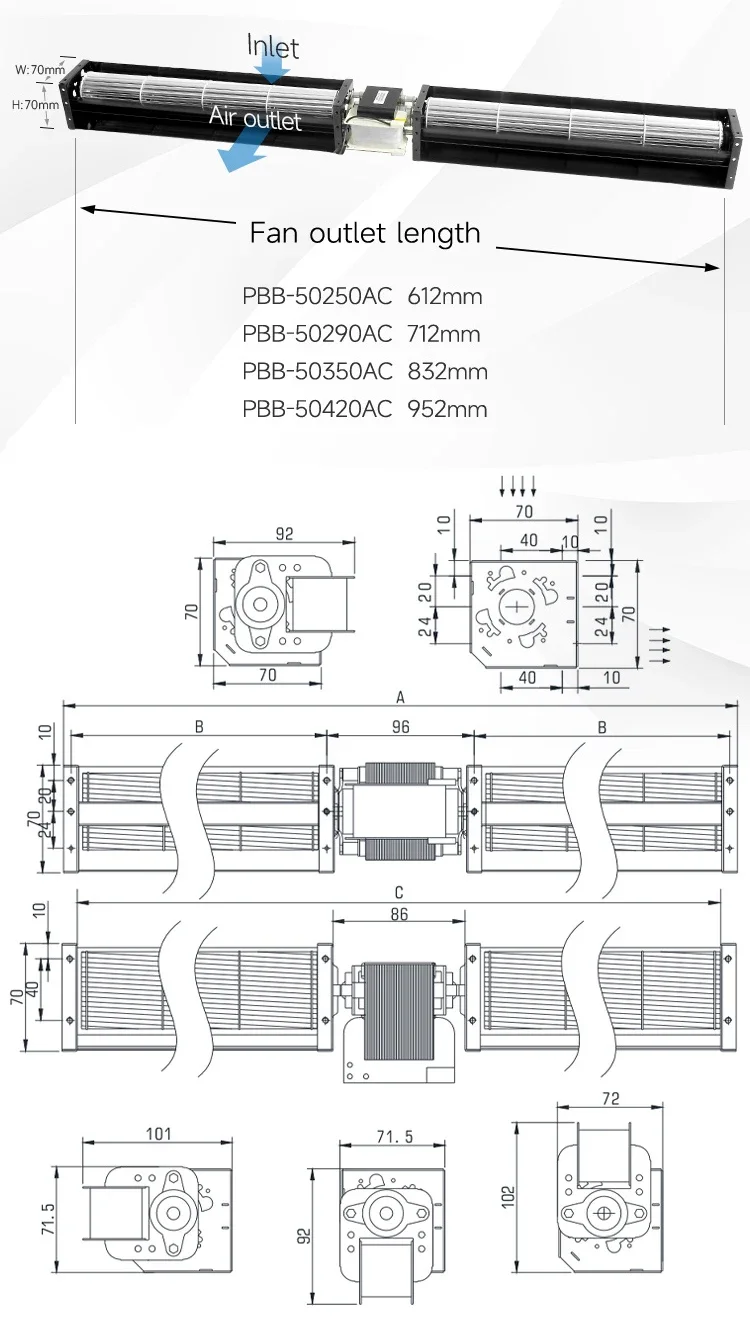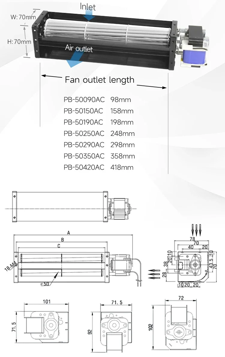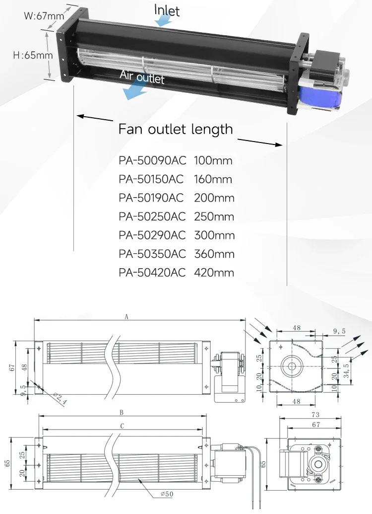 30AC Cross Flow Fan, 40AC Cross Flow Fan, 43AC Cross Flow Fan, 45AC Cross Flow Fan, 48AC Cross Flow Fan, 50AC Cross Flow Fan, 60AC Cross Flow Fan, 65AC Cross Flow Fan