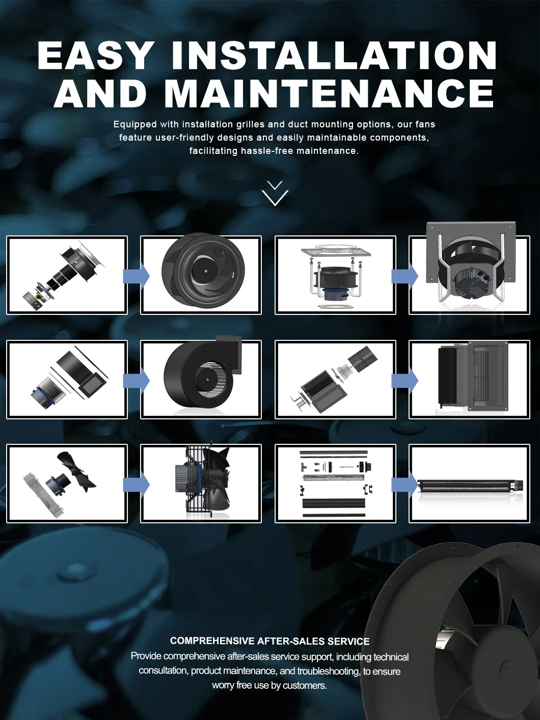 5. Easy Installation and Maintenance: Equipped with installation grilles and duct mounting options, our fans feature user-friendly designs and easily maintainable components, facilitating hassle-free maintenance.