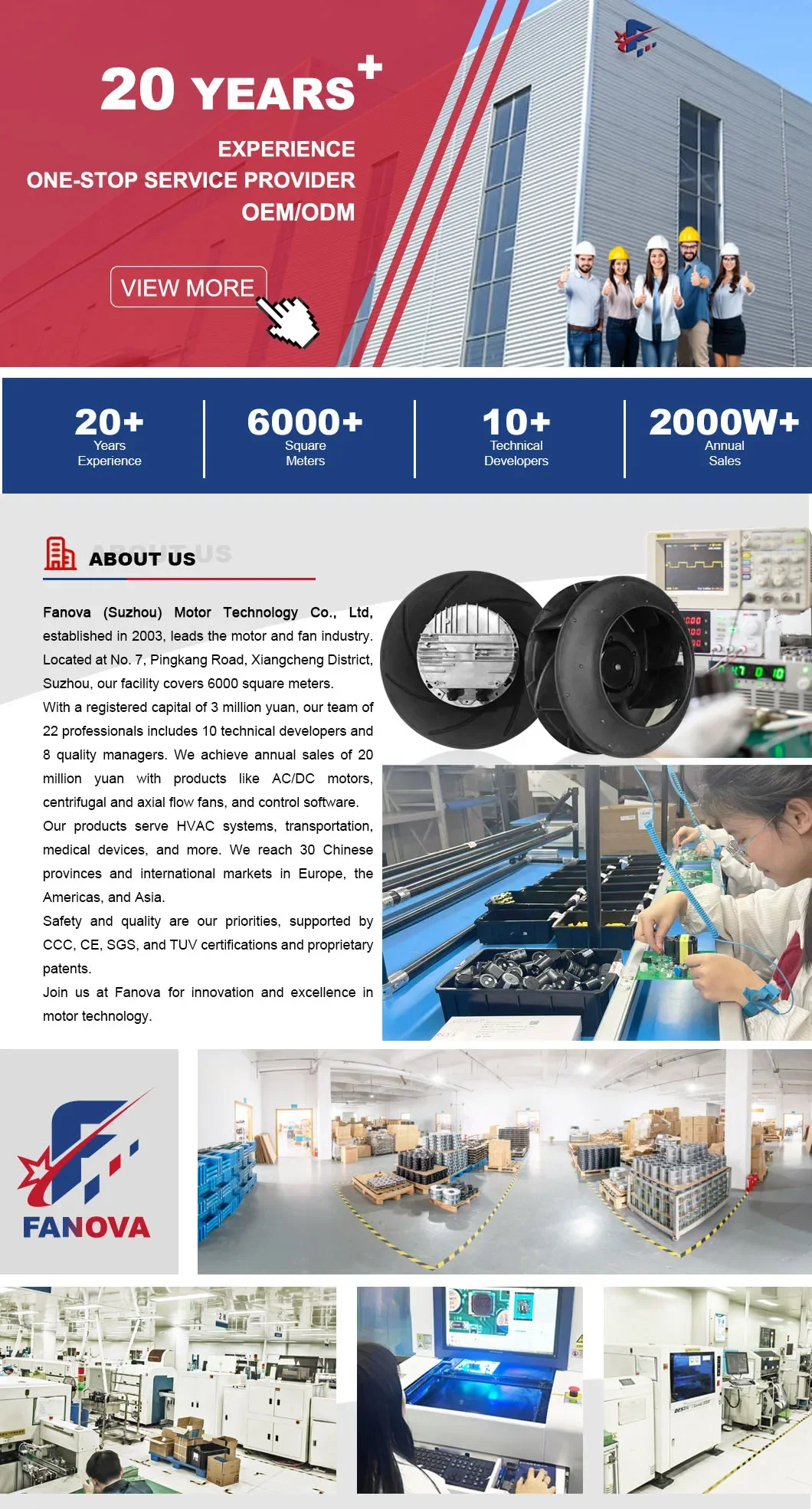Fanova (Suzhou) Motor Technology Co., LTD is a specialized research, design, and production enterprise focusing on AC fans, DC motors, centrifugal fans, axial fans, and cross-flow fans. Established in 2003, the company has evolved into a prominent player in the motor and fan industry, providing customers with high-quality products and outstanding services. It has established a strong influence in the market and earned a reputation for its commitment to innovation, reliability, and customer satisfaction. As a professional EC fan manufacturer, we possess advanced production equipment and a skilled technical team dedicated to providing comprehensive solutions to our customers. Our products are widely used in various industries, including industrial, commercial, and residential sectors, covering applications such as purification equipment, HVAC equipment, ventilation equipment, transportation facilities, medical facilities, household appliances, and machinery. We aim to provide customers with efficient and energy-saving solutions for airflow power needs. The company boasts a professional R&D team, dedicated to driving continuous innovation and technological breakthroughs in product development. Our R&D efforts focus on exploring new plastic materials, enhancing motor and fan designs, improving manufacturing processes to stay at the forefront of industry trends. Our products have passed multiple international certifications, including CE, UL, ROHS, providing customers with reliable assurance and meeting the diverse needs of different application areas.
