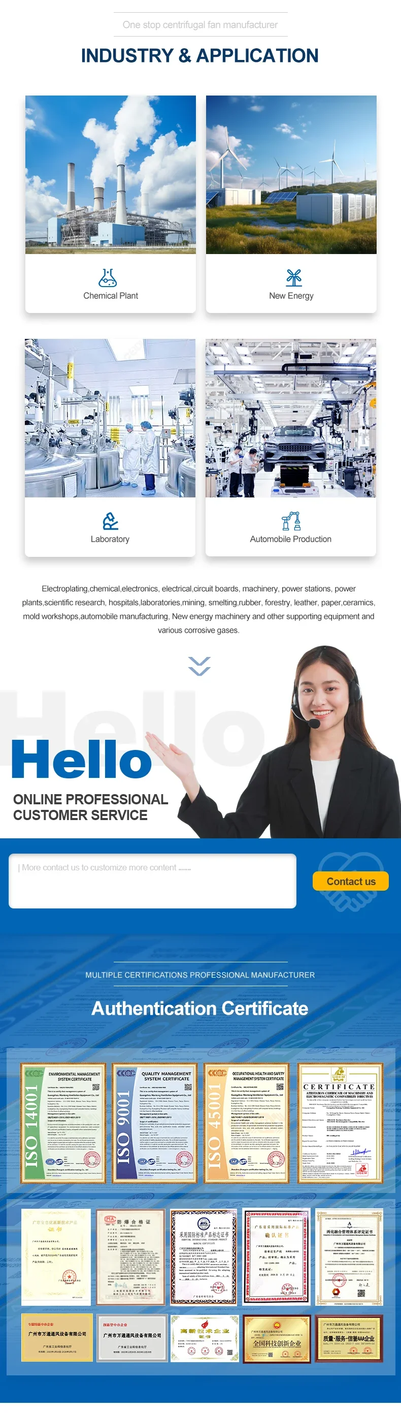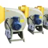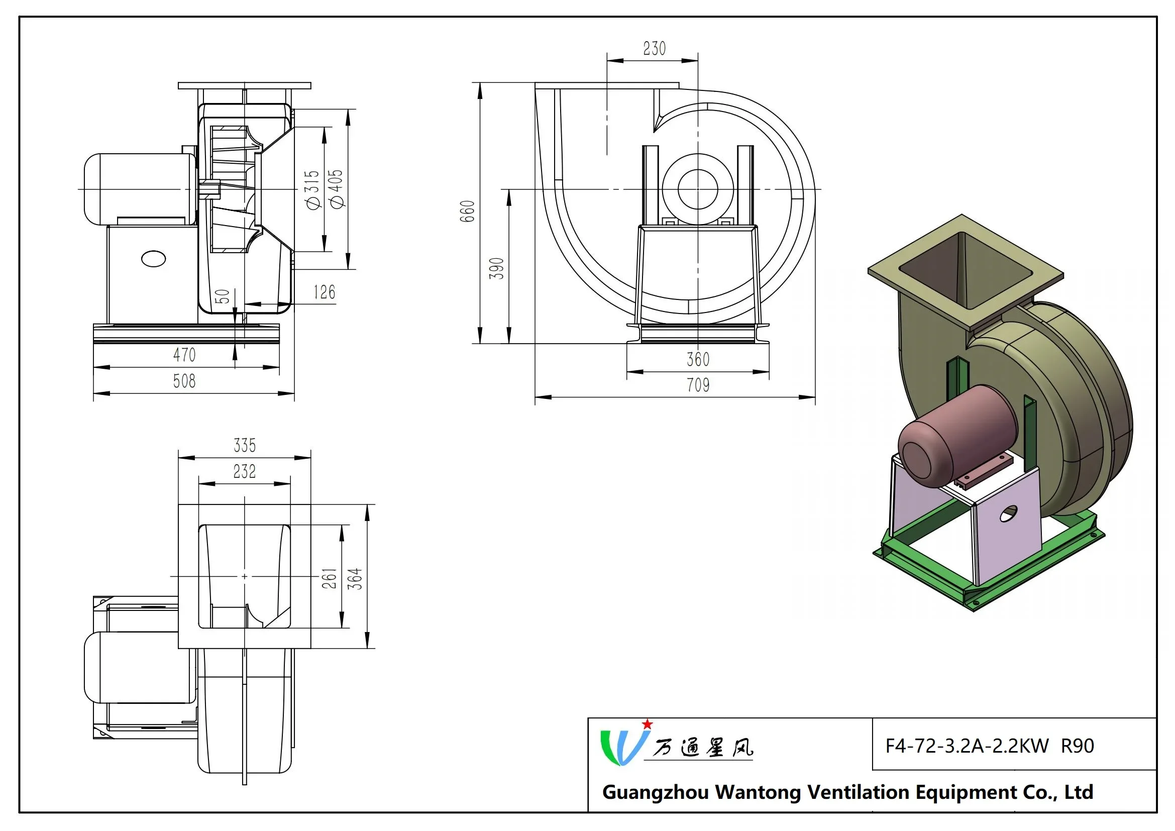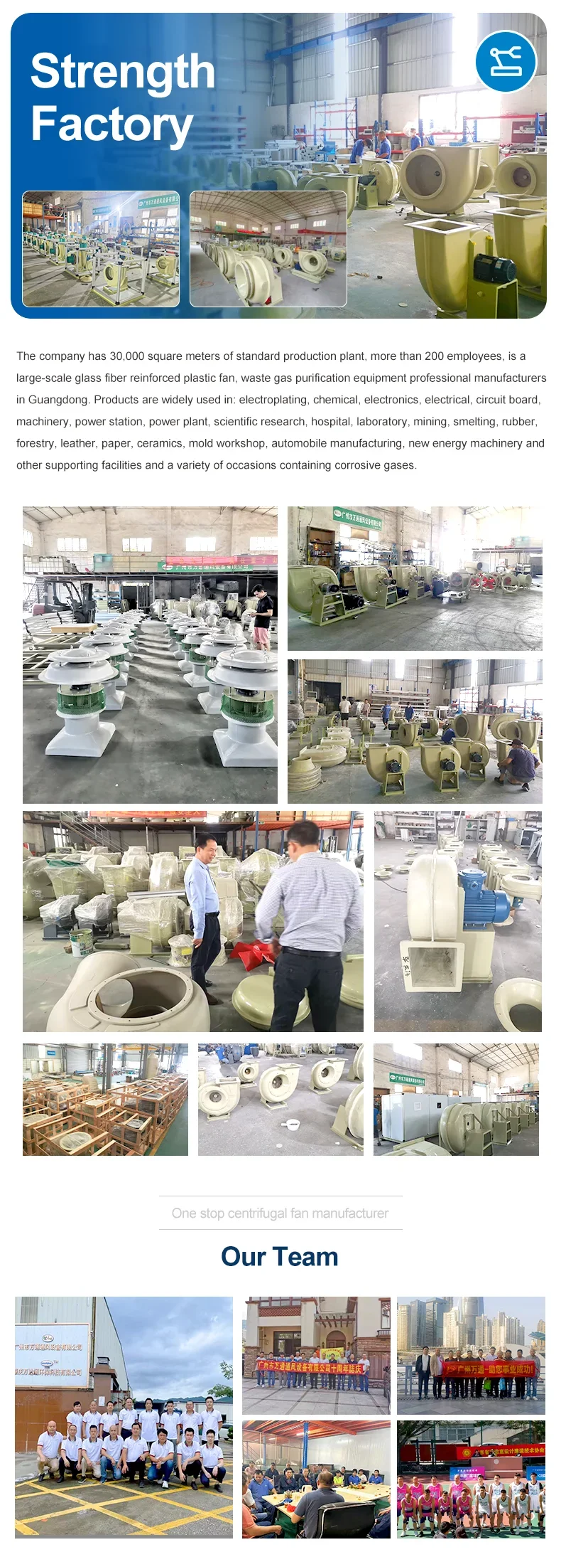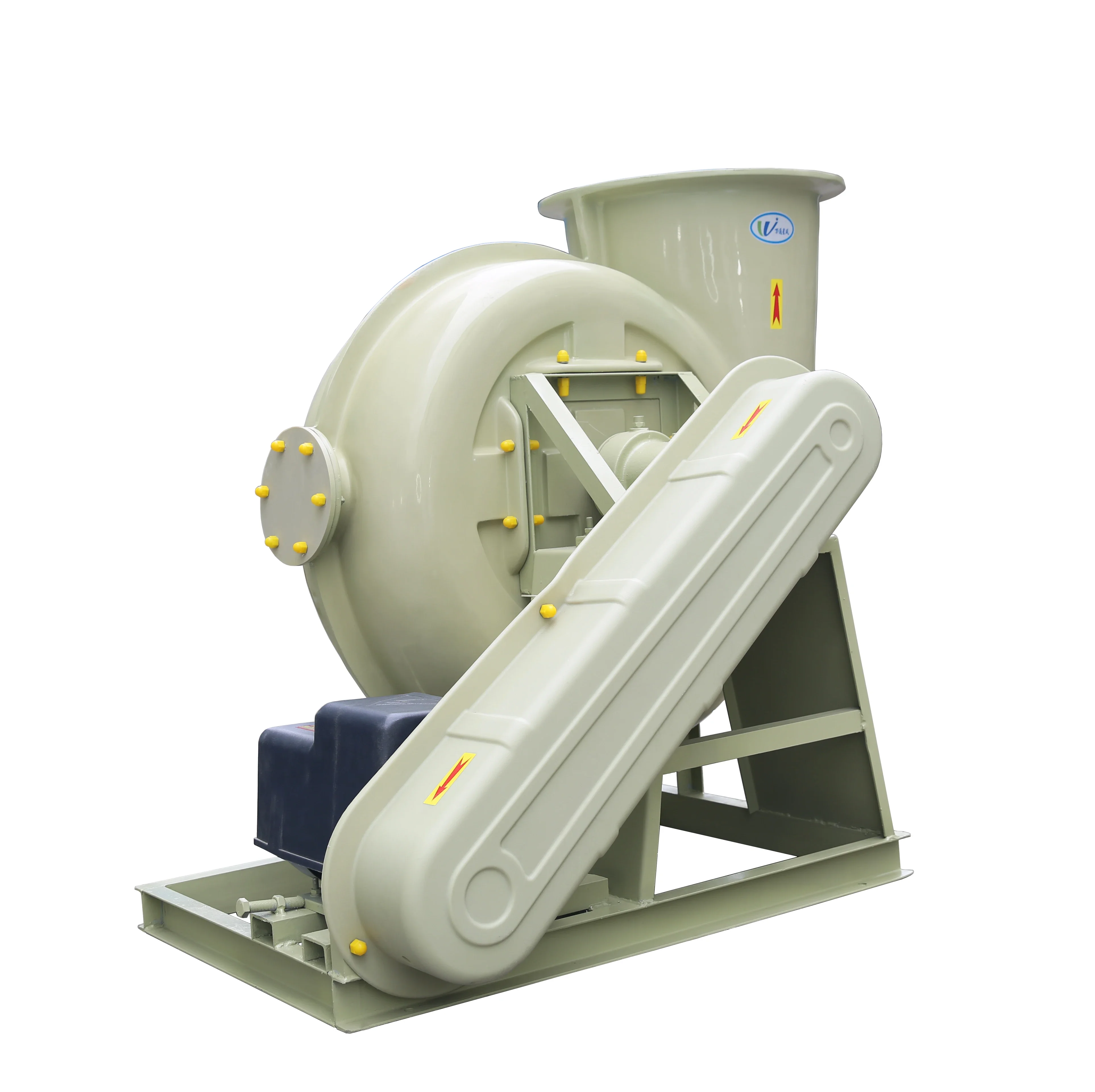 The F4-72 type FRP centrifugal fan is made of glass fiber and resin molding withreference to the performance parameters of the metal 4-72 type fan. The series of fans cantransport corrosive gases containing acid and alkali components and chemical componentsThe aas is not allowed to contain viscous substances, dust and hard particles is less than orequal to 150mg/m’, the gas temperature are less than 80, the relative humidity is less than100%. This series of fans is characterized by high strength, light weight, no ageing, goodcorrosion resistance, low noise and smooth operation. it is an ideal universal anti-corrosionblower, This series of fans are widely used in chemical. electroplating, oxidation, powerplants, laboratory, circuit board, environmental protection equipment and other sitescontaining corrosive gases. BF4-72 type glass FRP explosion-proof centrifugal fan is made from EXdl or EXdll classA and B grade explosion-proof isolation motor according to the customer’s use conditions. ltcan transport inflammable and explosive volatile gases including methane, ethane, propane.styrene, toluene, xylene, carbon monoxide, acetic acid, kerosene, gasoline and furan. Theperformance parameters and installation dimensions are consistent with the F4-72 type FRPcentrifugal fan.