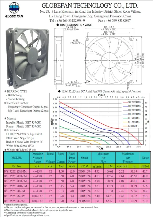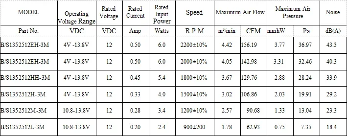 Function type is optional.The max. air flow and speed are measured in free air; max. air pressure is measured at close to zero air flow. Noise is measured in anechoic chamber in free air, one meter from intake side.All readings are typical values at rated voltage.Specifications are subject to change without notice.