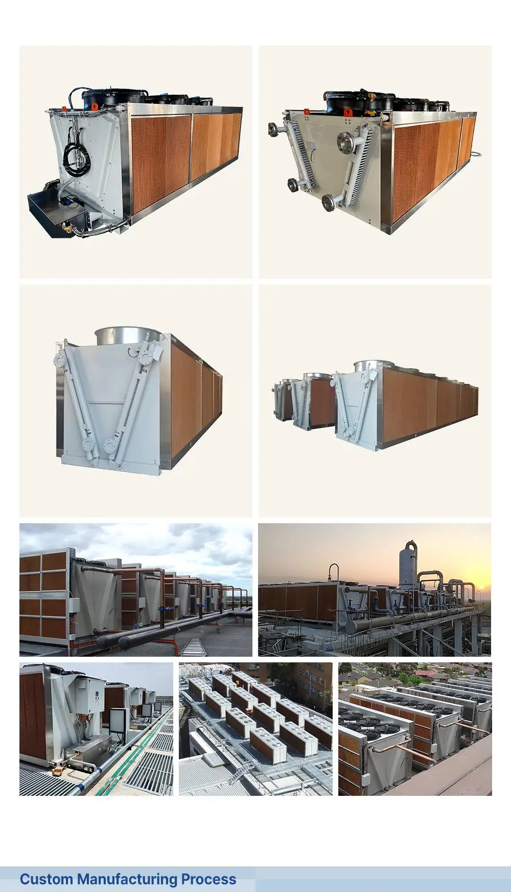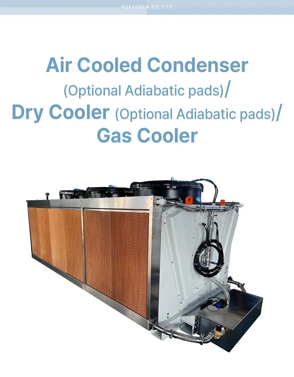 The Air Cooled Condenser / Dry Cooler / Gas Cooler is an advanced cooling system featuring adiabatic pads. This innovative pre-cooling method enables the condenser to achieve outlet temperatures below ambient or significantly improve unit performance within the same footprint.