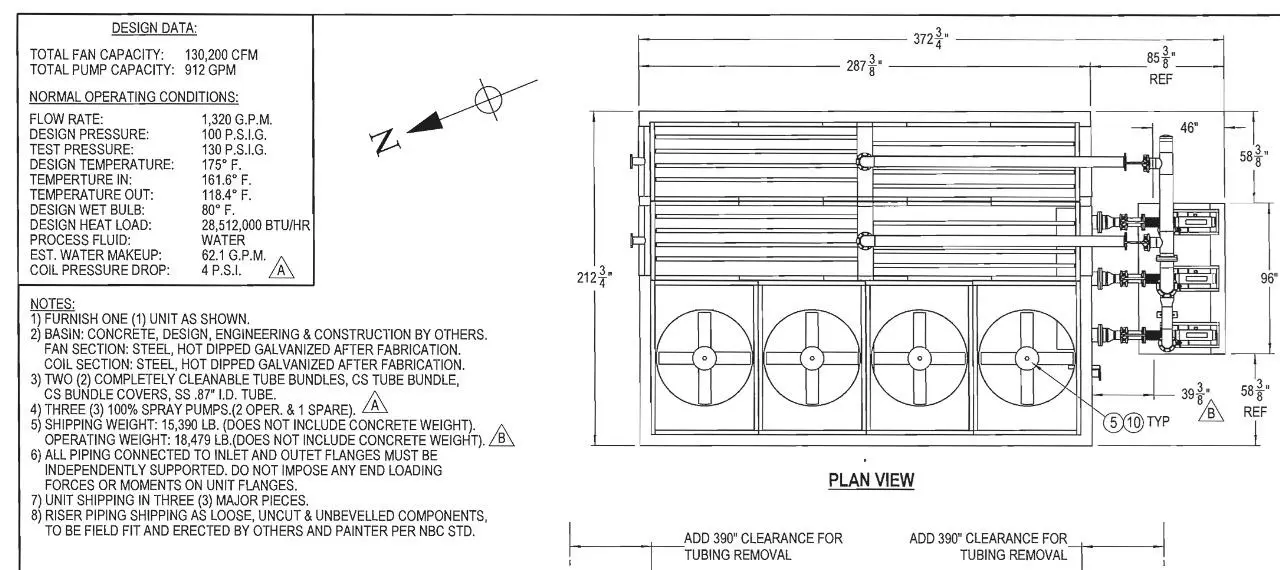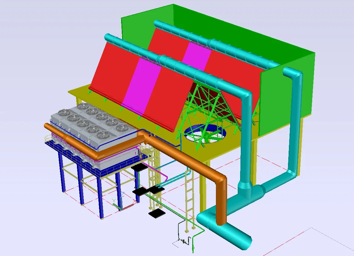 Dry Cooler operate similar to open cooling towers, except that the heat load to be rejected is transferred from the process fluid to the ambient air through a heat exchange coil. This creates two separate fluid circuits an external circuit, in which spray water circulates over the coil and mixes with the outside air, and an internal circuit, in which the process fluid circulates inside the coil. The coil isolate the process fluid from the outside air, keeping it clean and contamination free. Heat is transferred from the internal circuit, through the coil to the spray water, and then to the atmosphere as a portion of the water evaporates.