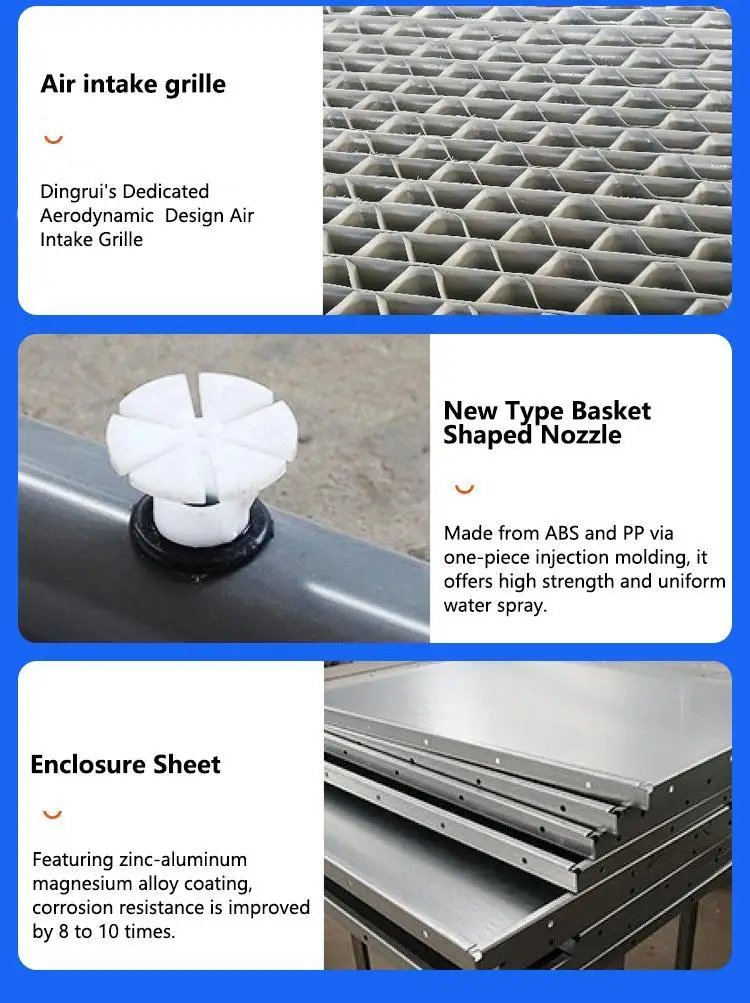 magnesium-aluminum-zinc plate. These materials are well-known corrosion-resistant materials and can ensure the long-term stable operation of the cooling tower. In addition, you can also customize cooling towers made of all 304 stainless steel and 316 stainless steel to meet specific application needs.