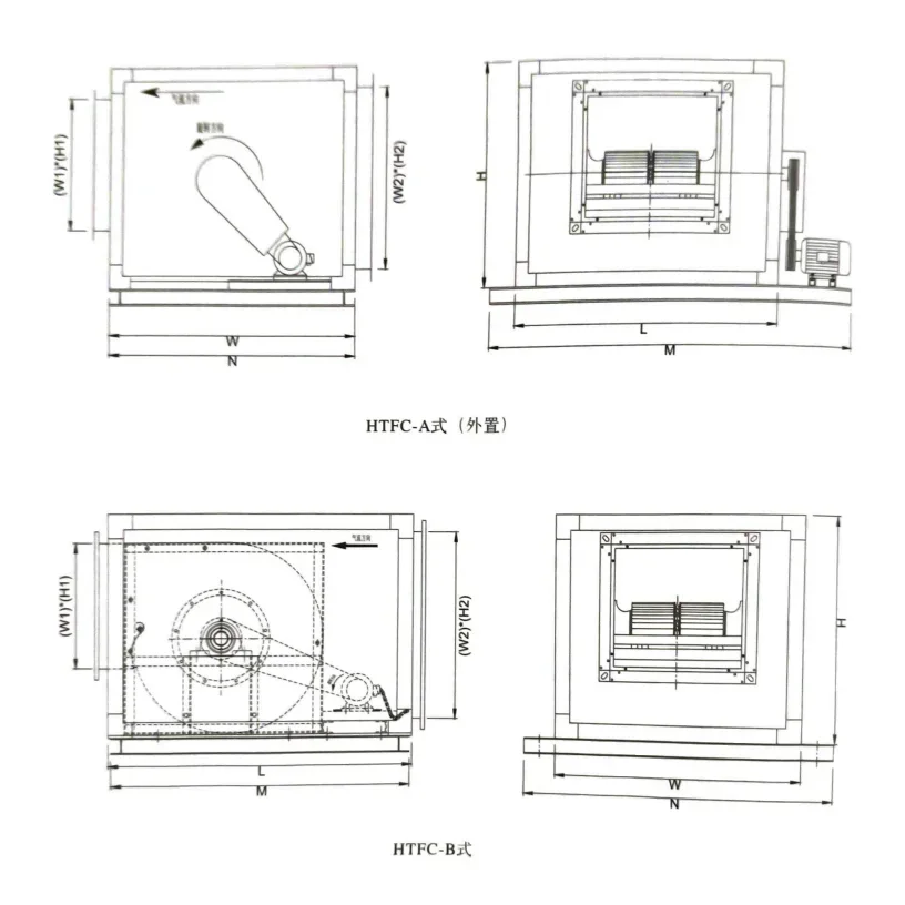 The HTFC type forward-leaning cabinet-style centrifugal fan is a high-efficiency, low-noise cabinet-style centrifugal fan. The product consists of a low-noise forward-leaning multi-blade centrifugal fan, motor, bearings, and transmission components. Depending on the installation location, there are 12 different angles for the inlet and outlet positions, catering to various installation needs of users.