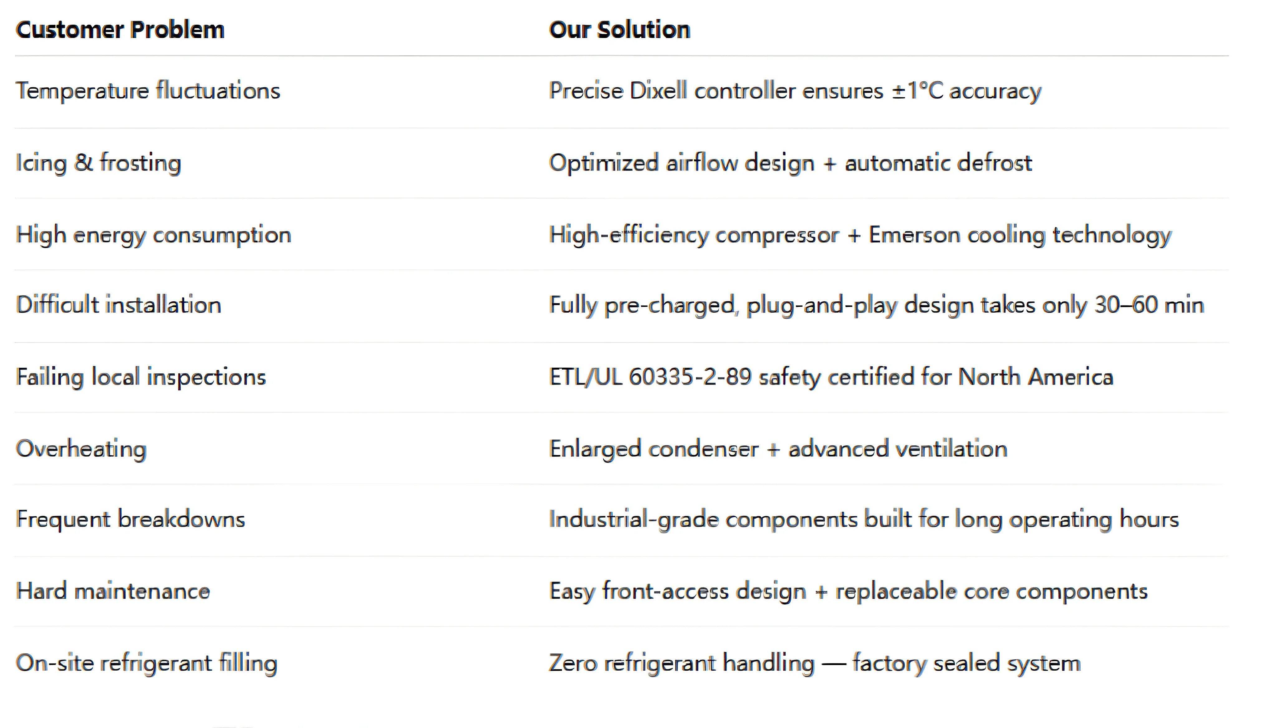 Our monoblock refrigeration unit is designed specifically to solve these pain points for small and medium-sized walk-in cold rooms.