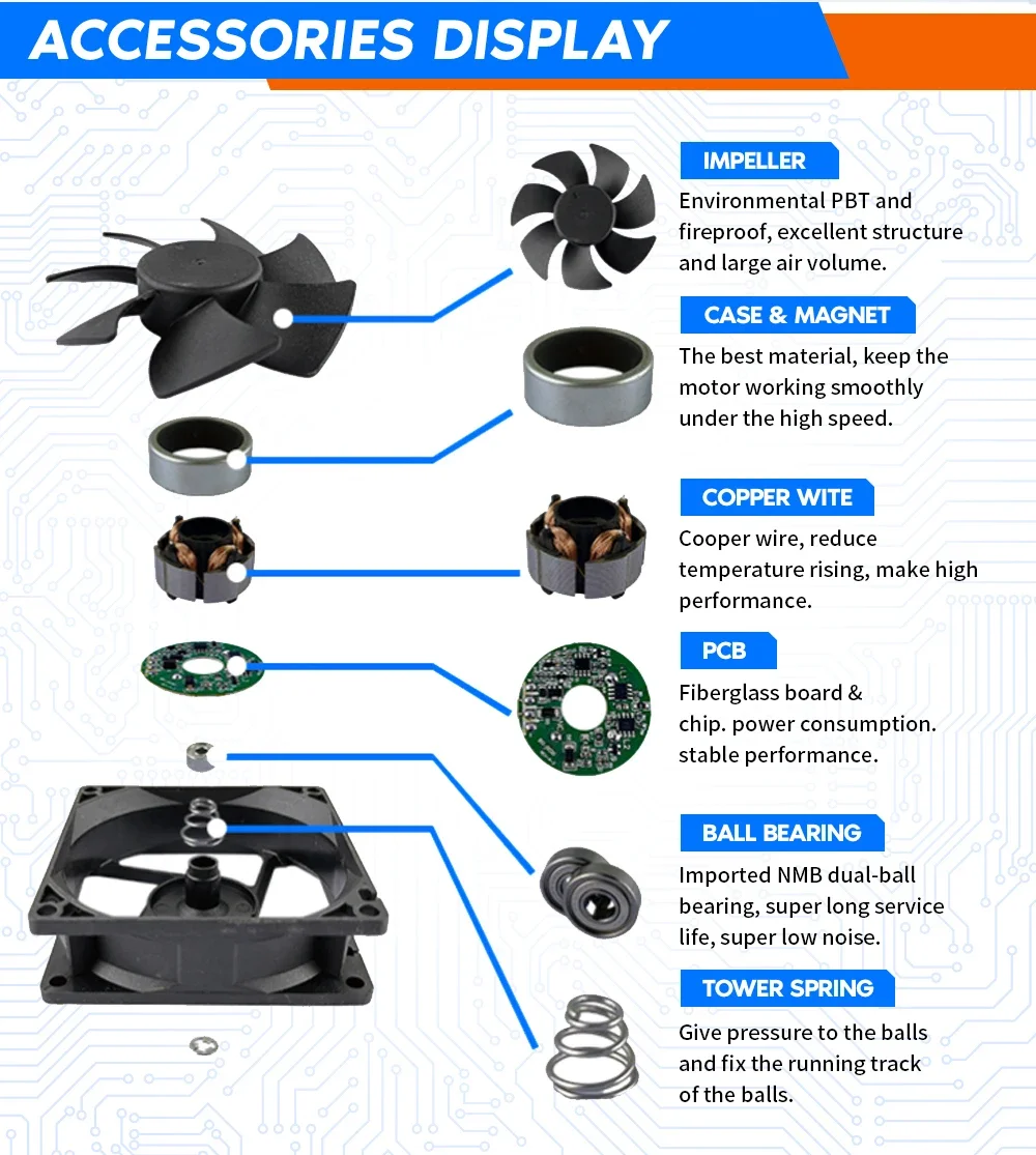 A: DC FAN,axial flow fan,Cross-flow fan,DC motor