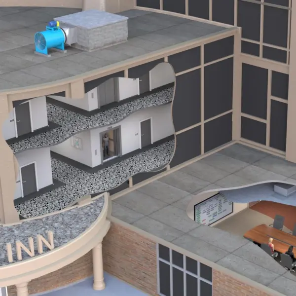 These ventilation systems extract the hot gases generated at the start of a fire and create smoke-free zones underneath the floating smoke layers, thereby improving evacuation conditions and facilitating firefighting. They also prevent secondary fires and control the temperature of the smoke to prevent a building from collapsing.