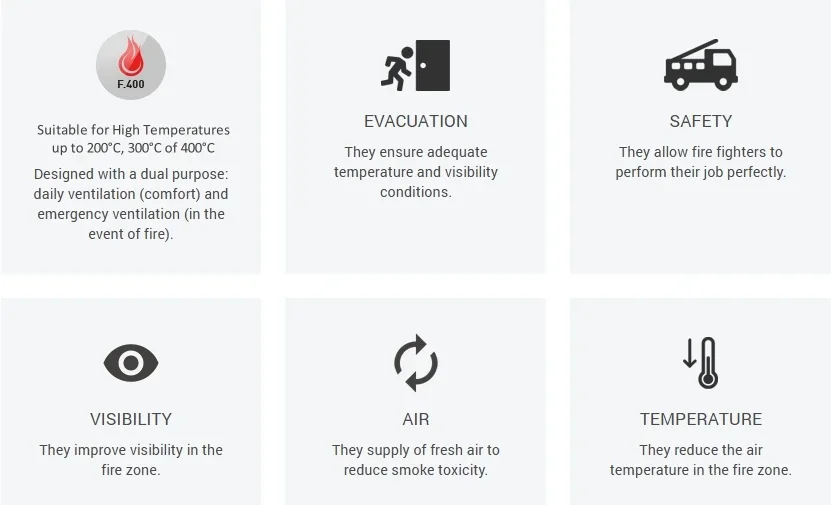These ventilation systems extract the hot gases generated at the start of a fire and create smoke-free zones underneath the floating smoke layers, thereby improving evacuation conditions and facilitating firefighting. They also prevent secondary fires and control the temperature of the smoke to prevent a building from collapsing.