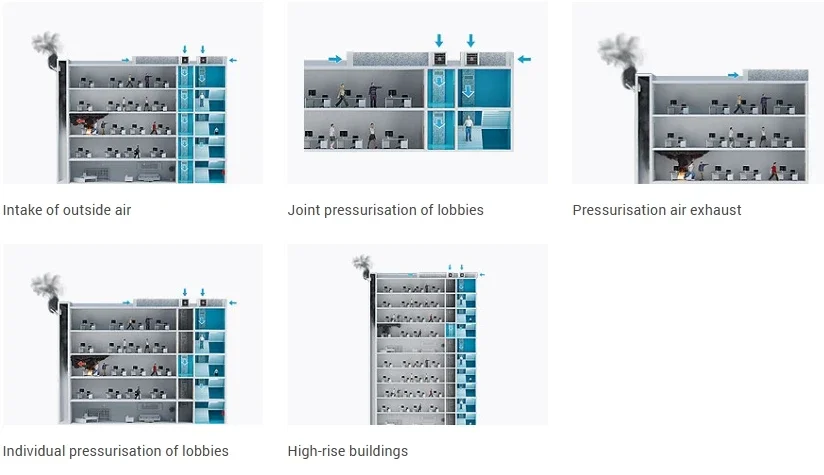 Pressurisation control systems protect evacuation routes in the event of fire by preventing the entry of smoke through air