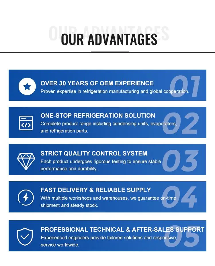 A2: We supply a full range of refrigeration products — condensing units, evaporators, condensers, refrigeration parts.