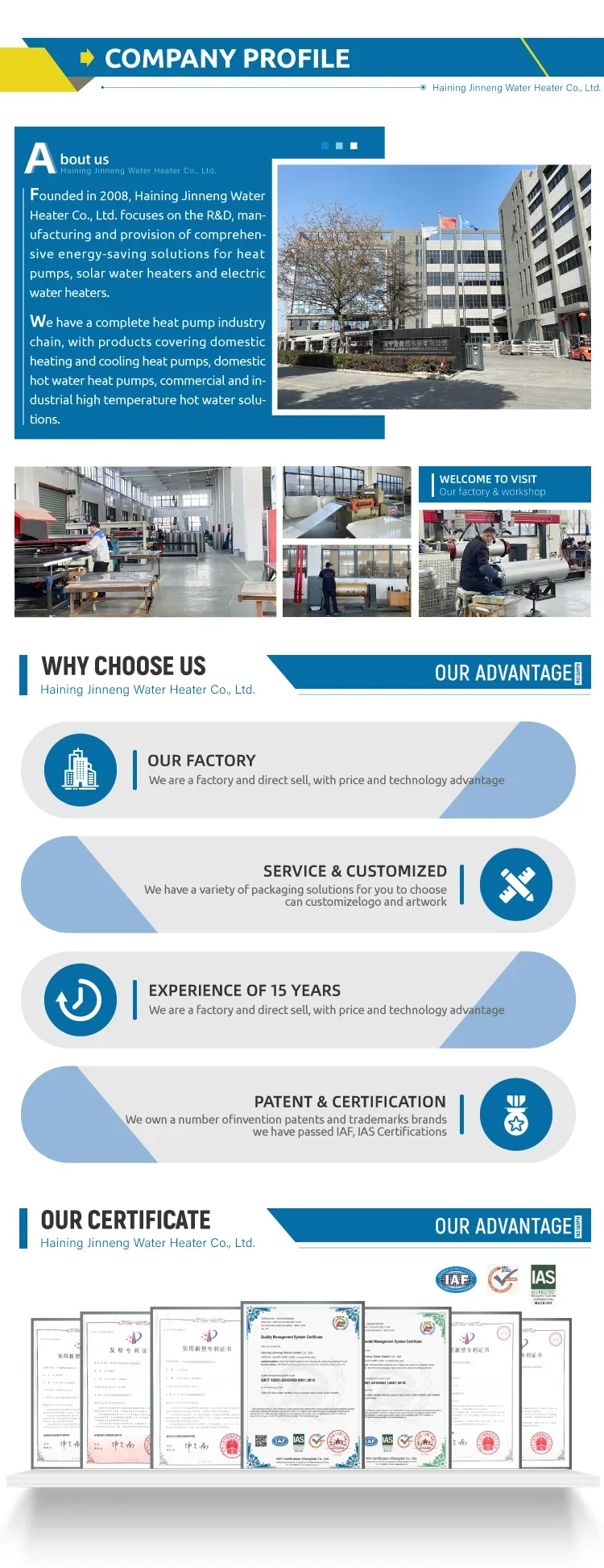Haining Jinneng is a professional manufacturer of on/off heat pump, DC frequency conversion heat pump, air source heat pump,water-water heat pump, swimming pool heat pump, high temperature heat pump and other types of heat pump.