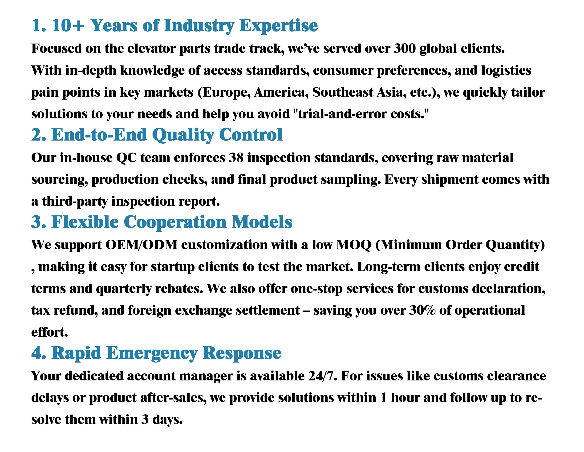 Nanjing Senhong Elevator Parts Co., Ltd. has been deeply engaged in the industry for over 10 years.Our company is located in Nanjing City, Jiangsu Province. As a professional enterprise, we are committed to providing high-quality elevator parts to global customers.