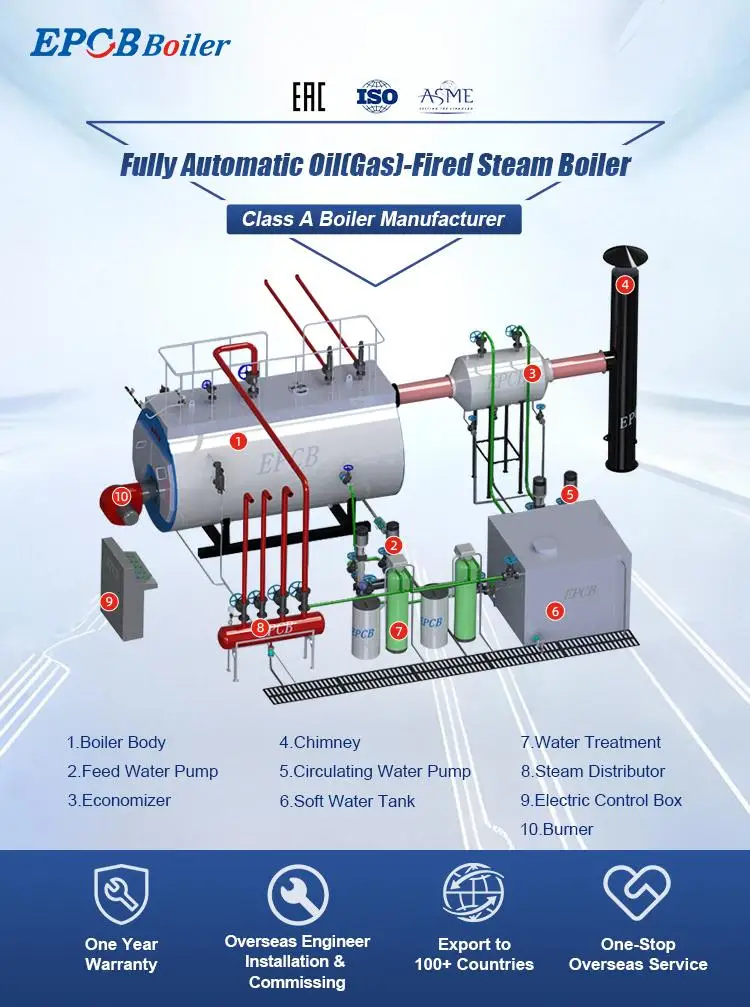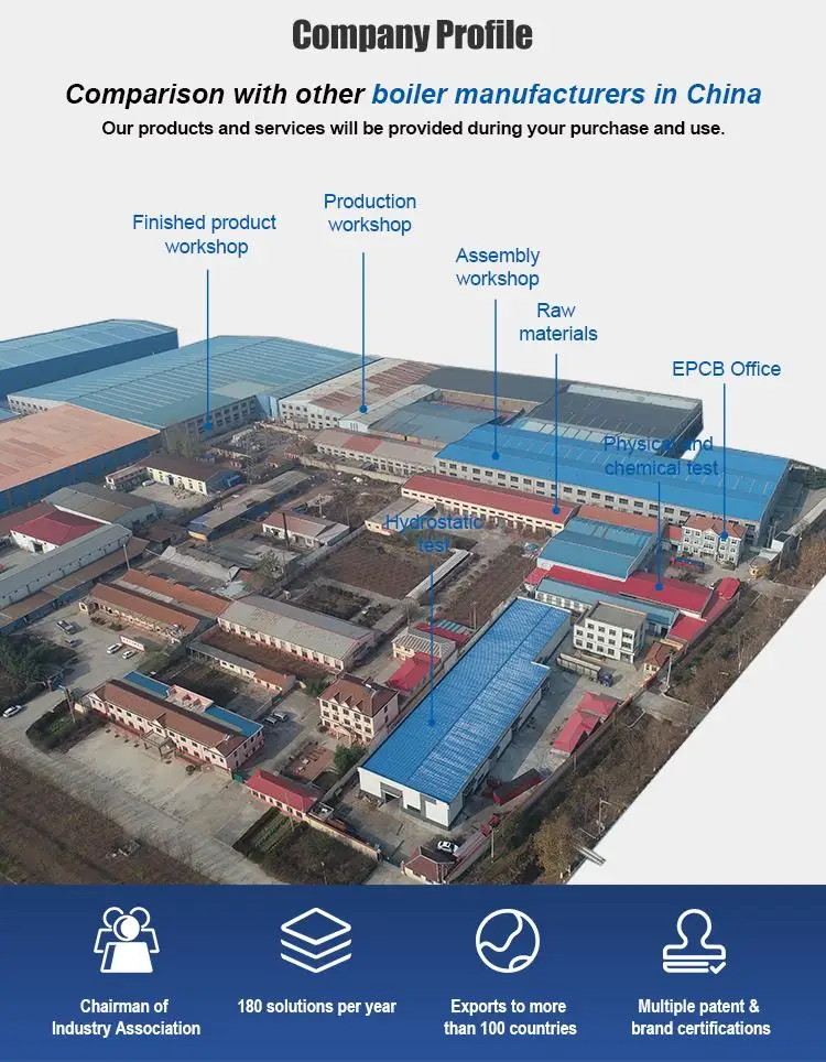 After more than seventy years of development, EPCB Boiler has grown into a professional boiler system solution provider integrating boiler design, manufacturing, installation, and maintenance. Our products cover steam boilers, thermal oil boilers, hot water boilers, power plant boilers, and other categories and can provide customized solutions according to customer needs. At present, our market has covered more than one hundred countries and regions in Asia, America, Europe, Africa, Oceania, etc. More than fifteen thousand companies around the world have chosen EPCB boilers, which are widely used in more than four hundred industries.The EPCB Boiler factory is located in Qingdao, an important industrial manufacturing base in China, covering an area of one hundred twenty thousand square meters. It has modern factory buildings, advanced production equipment, and a complete production line to ensure the stability and reliability of product quality. As of two thousand twenty-four, the annual production volume has reached two thousand units and continues to grow.Under a strict quality management system, we have obtained multiple international certifications: [Factory Certification] ISO nine thousand one; [Product Certification] CE, ASME, EAC, etc. EPCB Boiler always adheres to high-standard manufacturing to ensure the high performance, high safety, and long service life of each boiler, providing excellent heating solutions for global customers.