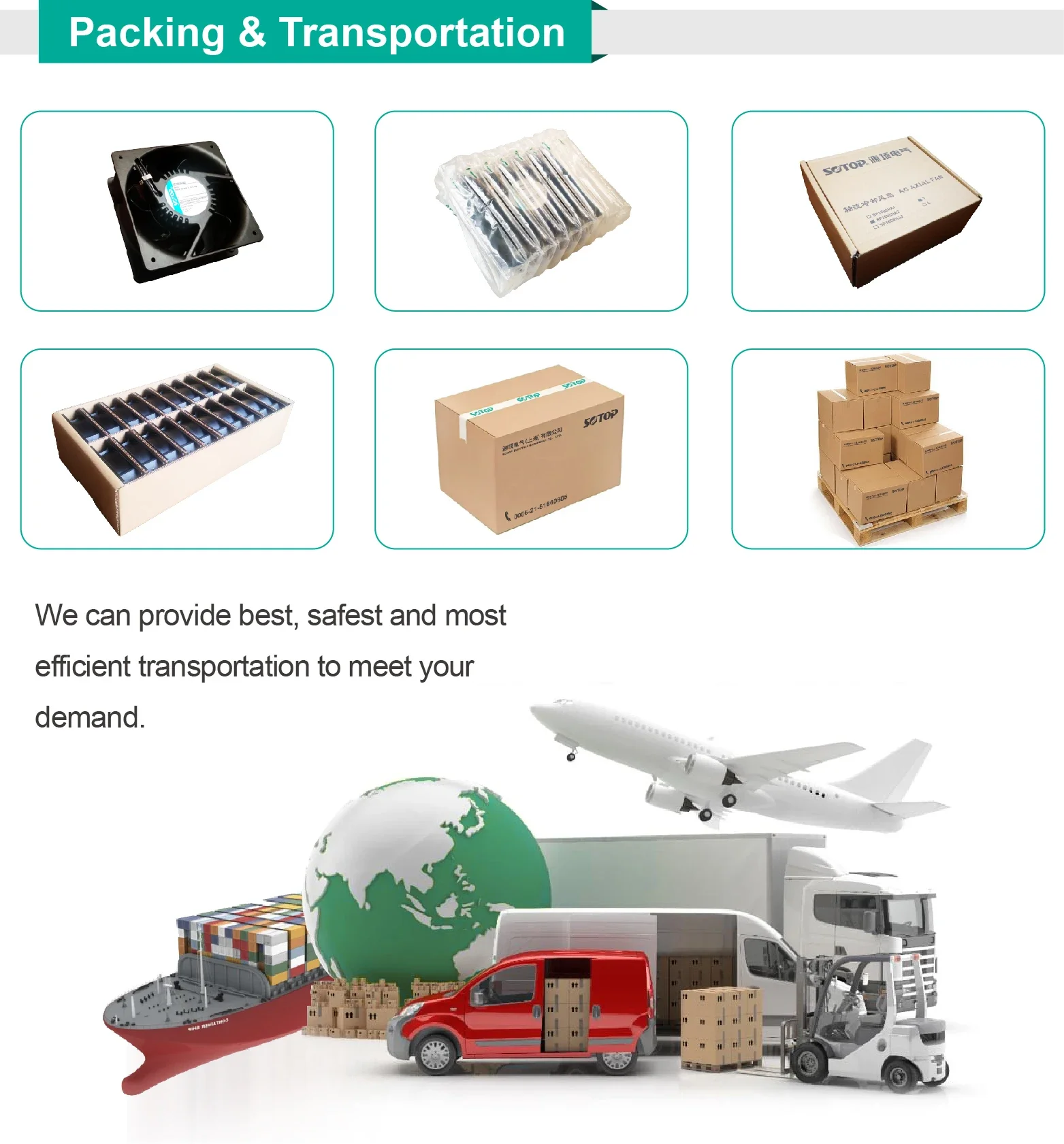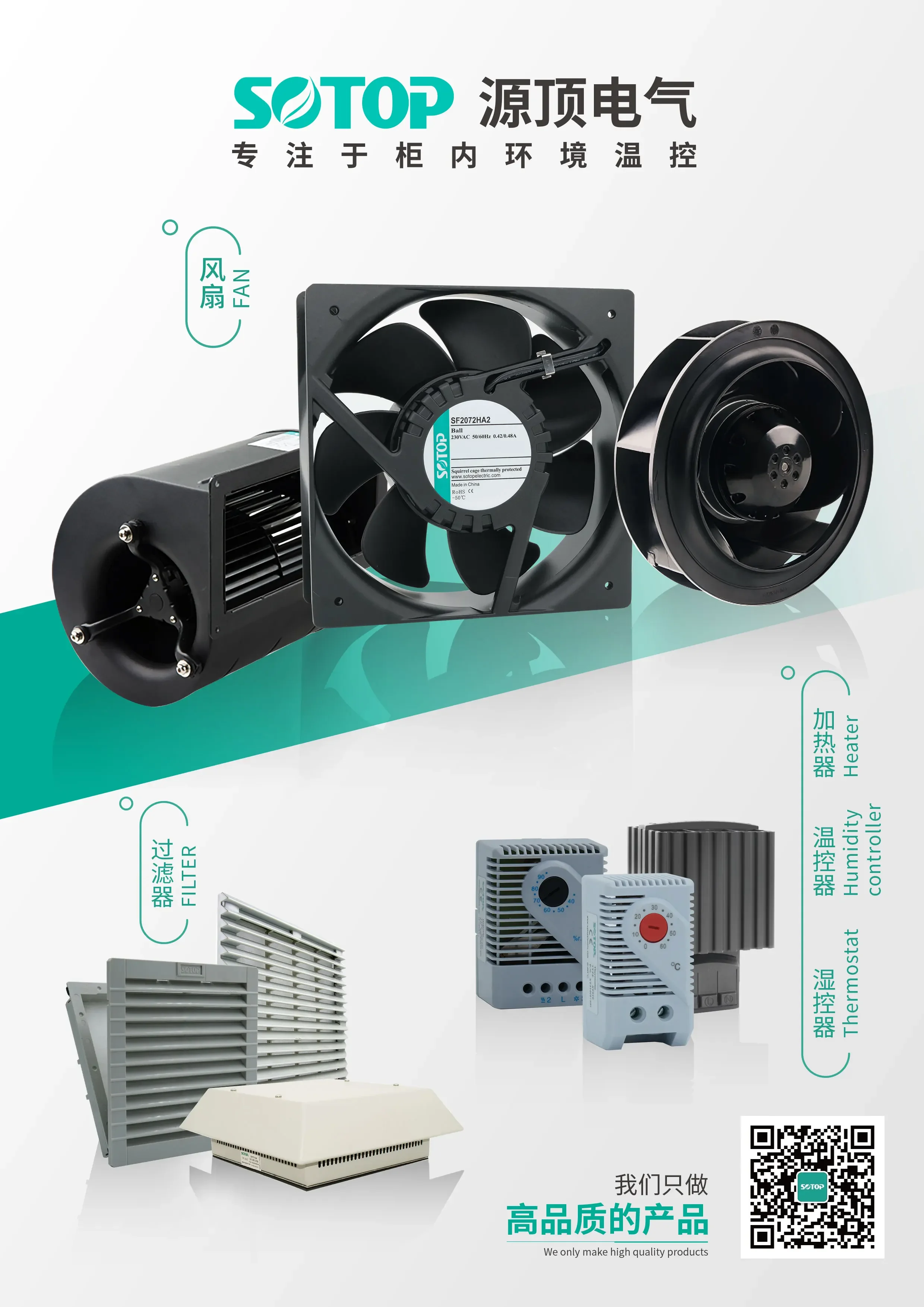 Being a professional manufacturer integrating R&D, production and sales for 20+ years, SOTOP focus on providing AC/DC/EC cooling fans and blowers, filters, heaters, thermostats, hygrostats and overall thermal solutions (ISO, CE, UL, CCC, ROHS, IP55 Certified). We provide customized OEM/ODM products and services for many well-known customers around the world like Siemens/ABB/Schneider/EMERSON. Our products are widely used on plastic molding machine, spinning machine, energy saving inverter, wind power, photovoltaic, charging pile, electric power, steel, subway, communications, medical equipment, robots, petrochemical and other industries.