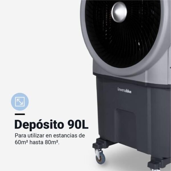 Discover the UniversalBlue TULUM 7090 Evaporative Air Cooler, your solution for combating the heat efficiently and ecologically. High-performance, high-capacity air cooler: The TULUM 7090 air cooler is designed with 350W of power and a large 90-liter tank, ideal for cooling rooms up to 80 m². Its powerful airflow of 10,000 m³/h ensures even distribution of cool air, providing a pleasant environment in every corner of your home. Versatile air cooler with an innovative design: This model offers 6 operating modes, including 3 adjustable speeds, cooling, and evaporation, perfectly adapting to your needs. With a noise level of only 45-65 dB, you’ll enjoy a quiet and relaxing environment. Easy to move: Thanks to its 4 multidirectional wheels, two of which have brakes, the TULUM 7090 can be easily moved from room to room, allowing you to enjoy coolness wherever you need it most without effort.