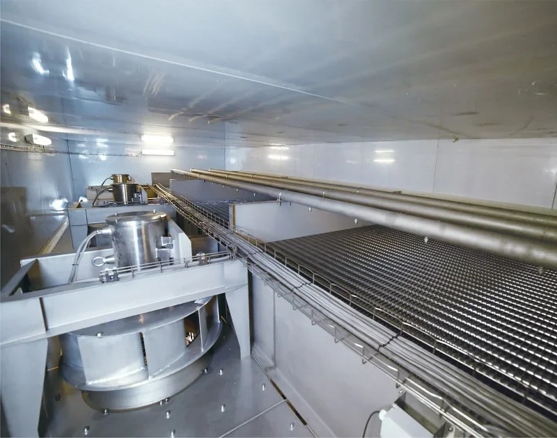 Conveyor System: Products are placed on a mesh belt or stacked multi-tier belts that carry them through the tunnel. Cold Air: High-velocity fans blow extremely cold air (often below -30°C) over the products. Cryogenics (Optional): Some systems use liquid nitrogen or CO2 for even faster freezing. IQF (Individual Quick Freezing): The rapid airflow freezes items individually, preventing them from clumping. Insulated Chamber: An insulated housing maintains the intense cold and prevents outside heat from entering.