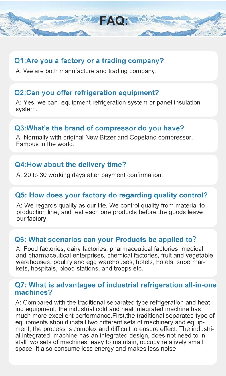 Main solutions: Catering cold storage, industrial cold storage, scientific research cold storage, agricultural cold storage, logistics cold storage, pharmaceutical cold storage.
