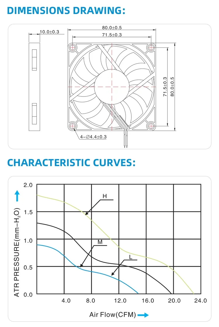 Size:80x80x10mm (3.2×3.2×0.4inch) Material:Frame and Impeller:Thermal Plastic PBTLead Wires: UL TypeRED Wire Positive(+) Black Wire Negative(-)Bearings:C=Ball Bearing, S=Sleeve BearingLife Expectancy: 70,000Hours at 20℃-Ball,